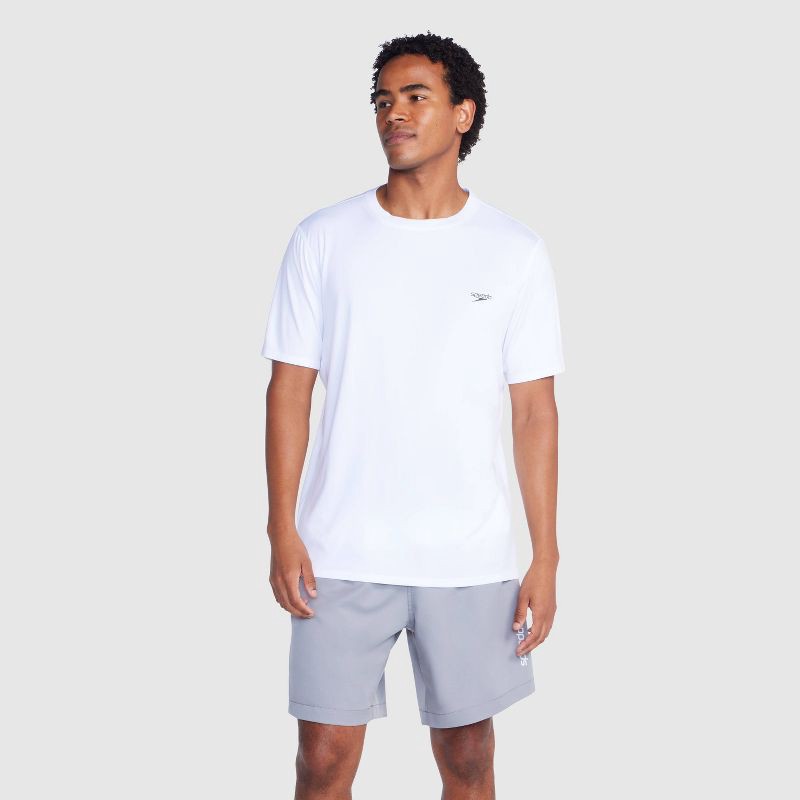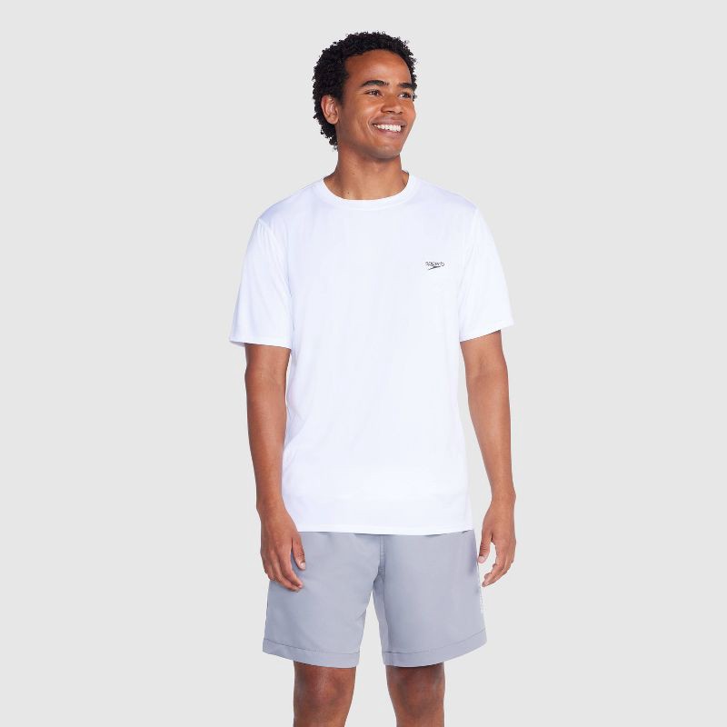 Speedo Men's Short Sleeve Rash Guard Swim Shirt - White S: UPF 50+ Woven Pullover, Small