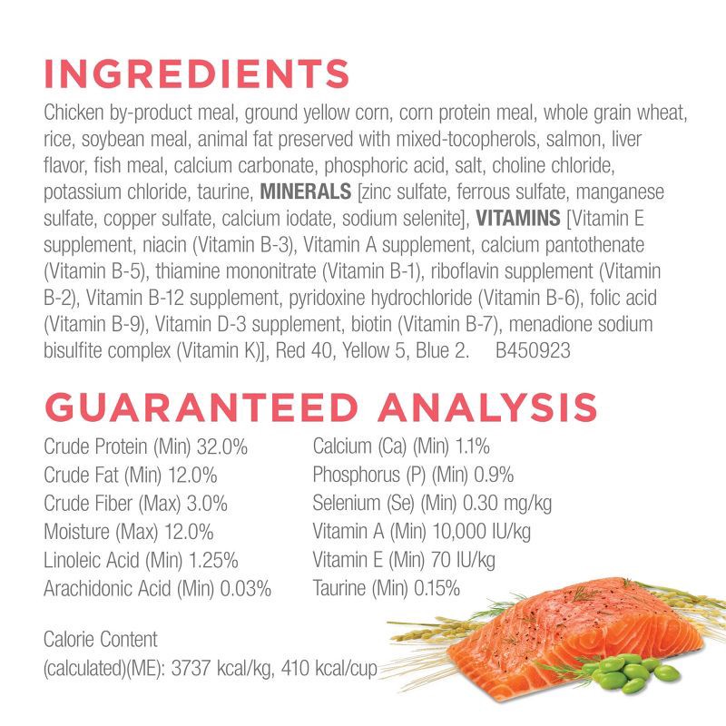 Chicken by-product meal, ground yellow corn, corn gluten meal, whole grain wheat, rice, soybean meal, beef fat preserved with mixed-tocopherols, salmon, fish meal, liver flavor, calcium carbonate, pho…