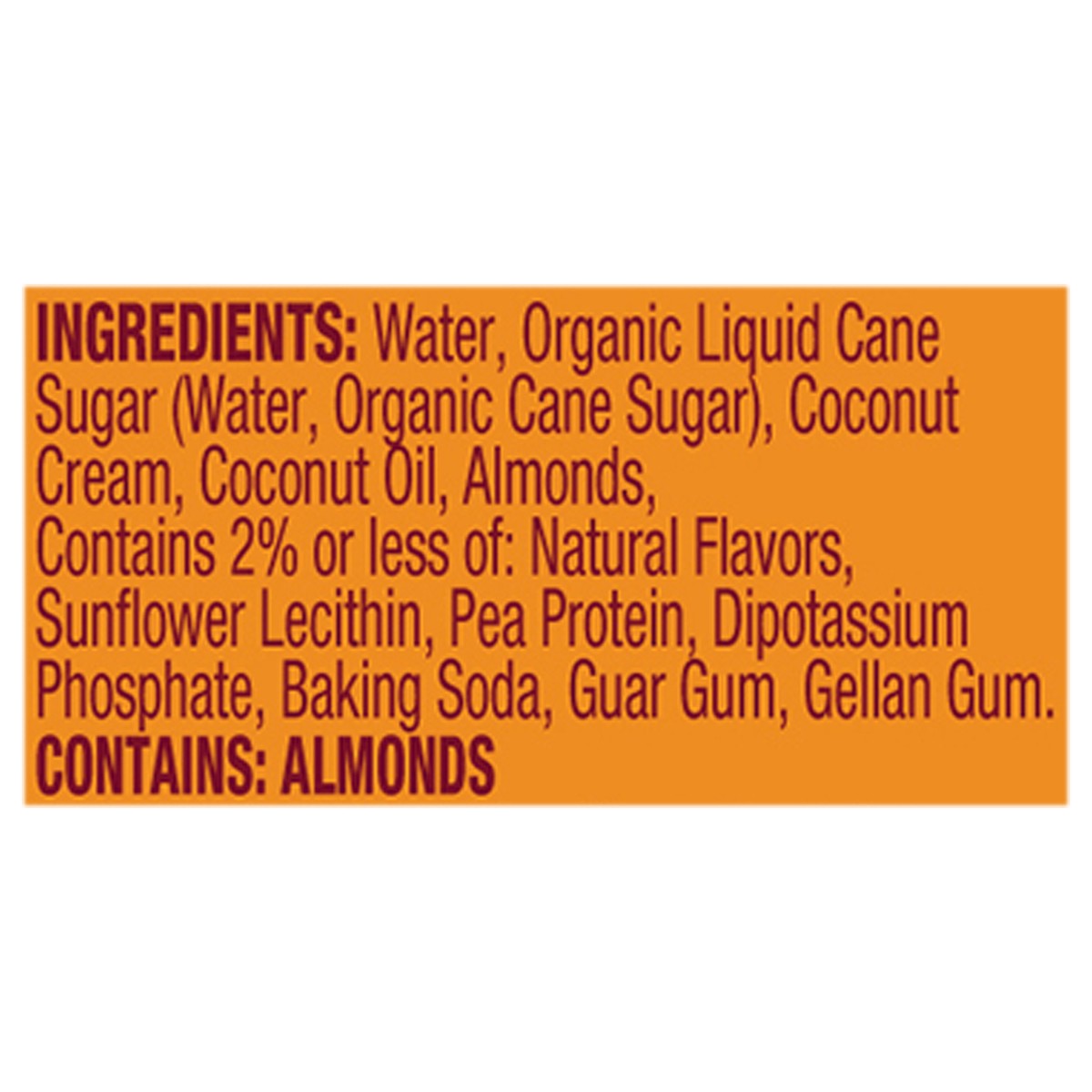 Almond Milk (Water, Almonds), Coconut Milk (Water, Coconut Cream), Organic Cane Sugar, Contains 2% or Less of: Natural Flavors, Dipotassium Phosphate, Sunflower Lecithin, Guar Gum, Sea Salt, Gellan Gu…