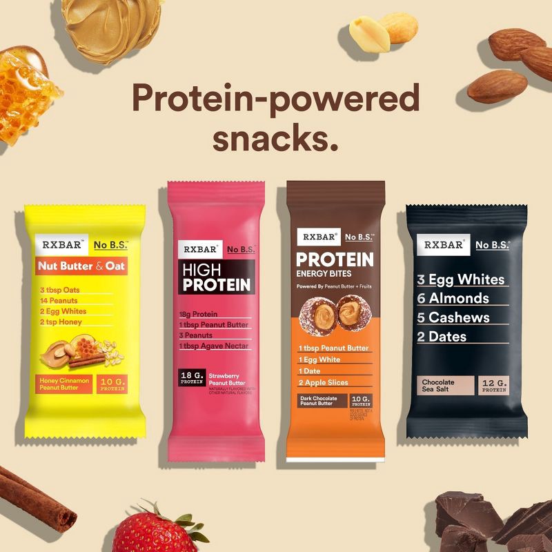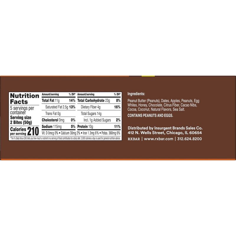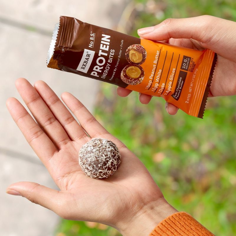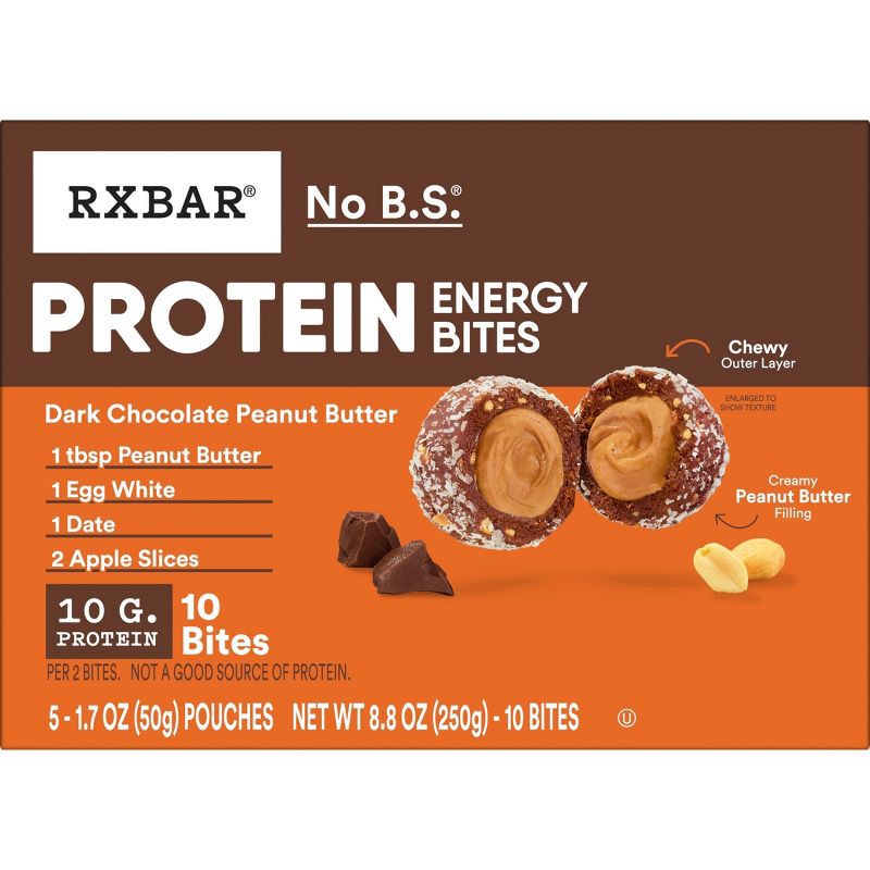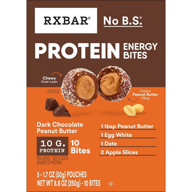 - Includes one 8.8oz box containing 5 pouches of RXBAR Protein Energy Bites Dark Chocolate Peanut Butter; Two bites per pouch