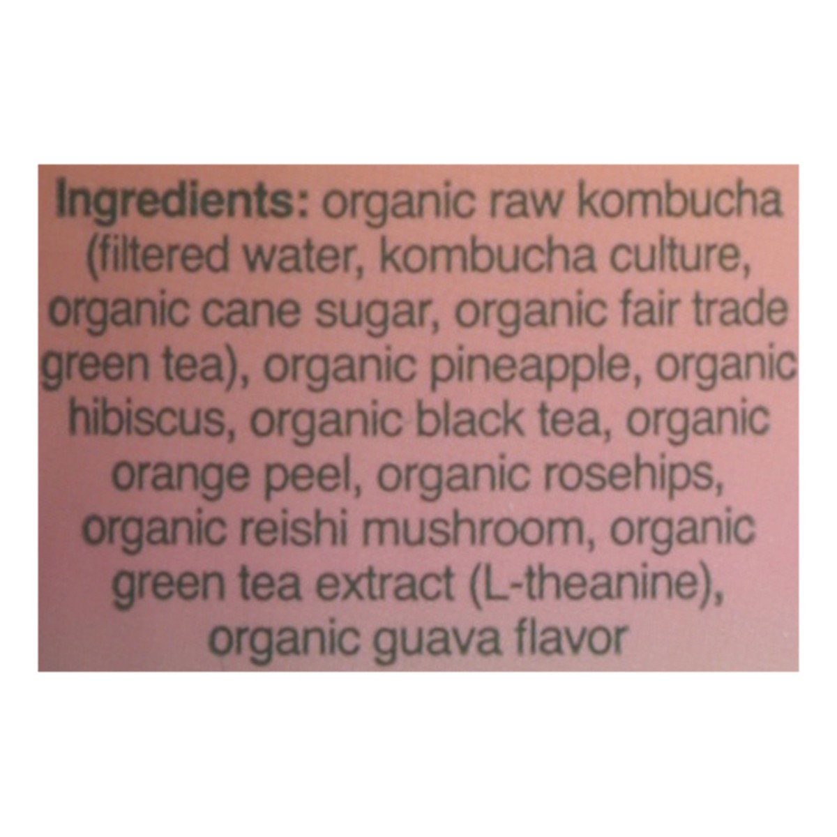 Organic Raw Kombucha (Filtered Water, Kombucha Culture, Organic Cane Sugar, Organic Fair Trade Green Tea), Organic Pineapple, Organic Hibiscus, Organic Black Tea, Organic Orange Peel, Organic Rosehips…