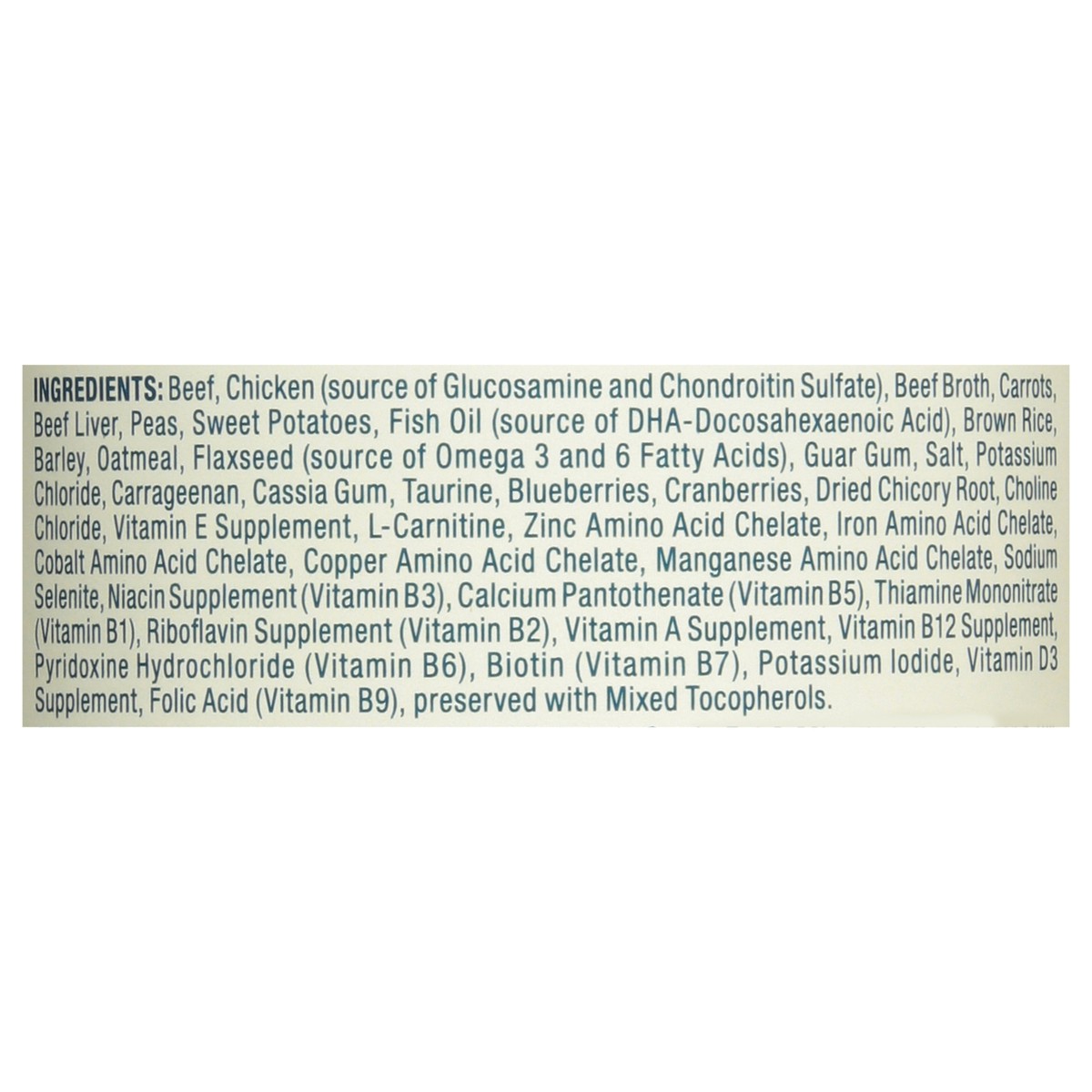 Beef, Chicken (Source of Glucosamine and Chondroitin Sulfate), Beef Broth, Carrots, Beef Liver, Peas, Sweet Potatoes, Fish Oil (Source of DHA-Docosahexaenoic Acid), Brown Rice, Barley, Oatmeal, Flaxse…
