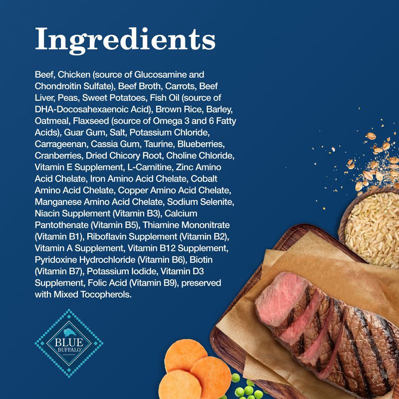 Beef, Chicken (Source of Glucosamine and Chondroitin Sulfate), Beef Broth, Carrots, Beef Liver, Peas, Sweet Potatoes, Fish Oil (Source of DHA-Docosahexaenoic Acid), Brown Rice, Barley, Oatmeal, Flaxse…