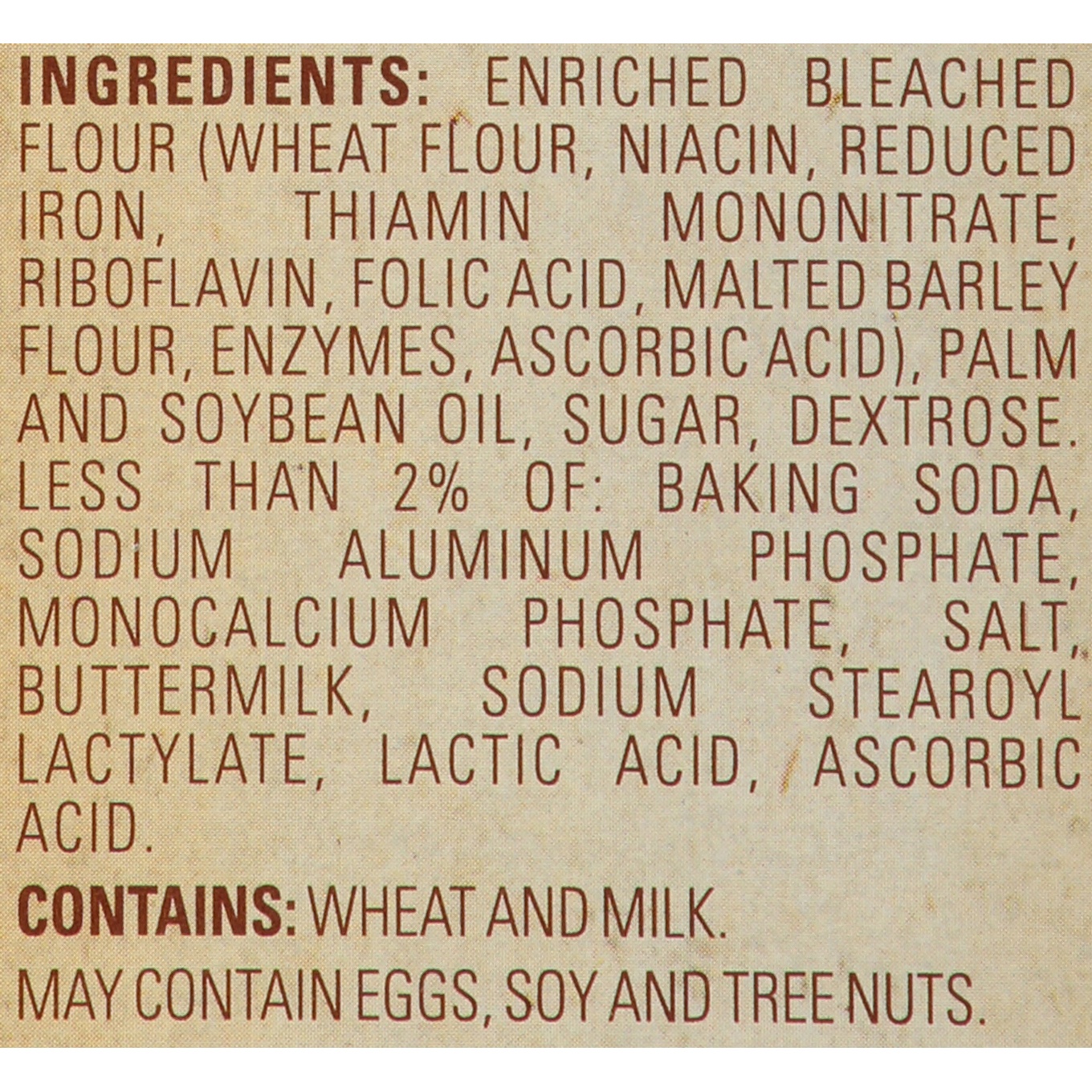 Enriched Bleached Flour (Wheat Flour, Malted Barley Flour, Niacin, Reduced Iron, Thiamin Mononitrate, Riboflavin, Folic Acid), Palm and Soybean Oil, Sugar, Dextrose, Less than 2% of: Ascorbic Acid, Ba…