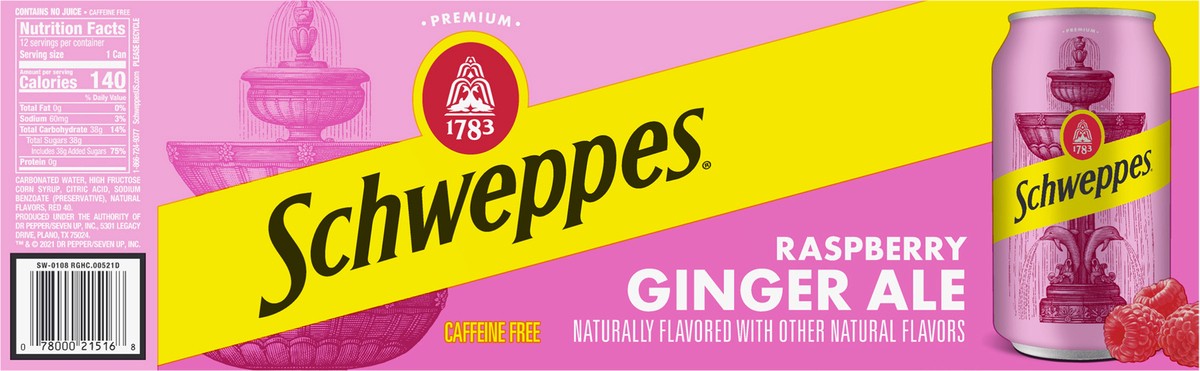 For over 200 years, Schweppes has produced classic carbonated beverages. Schweppes Raspberry Ginger Ale combines the mild taste of real ginger with sweet raspberry flavor and is caffeine free. Enjoy i…