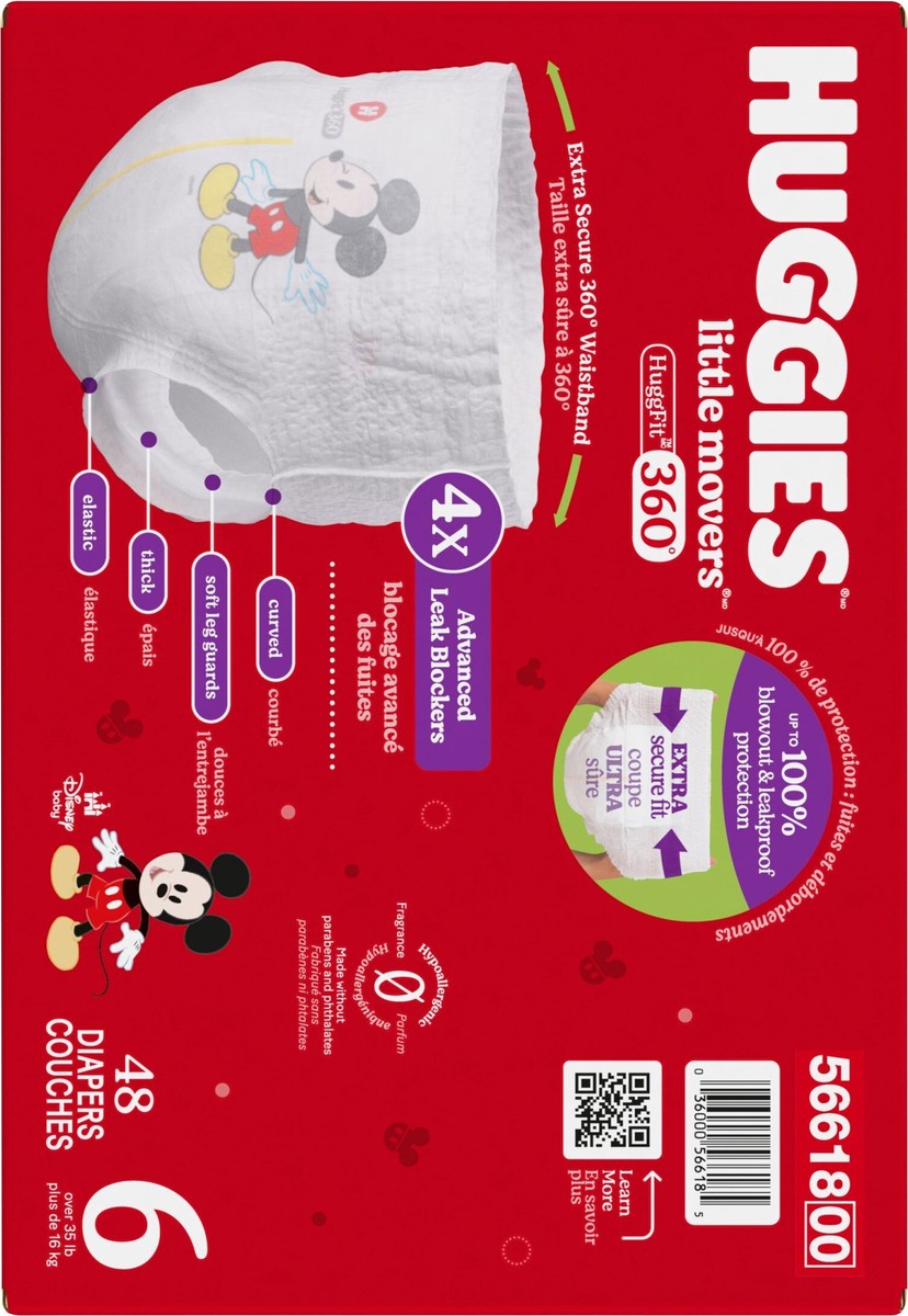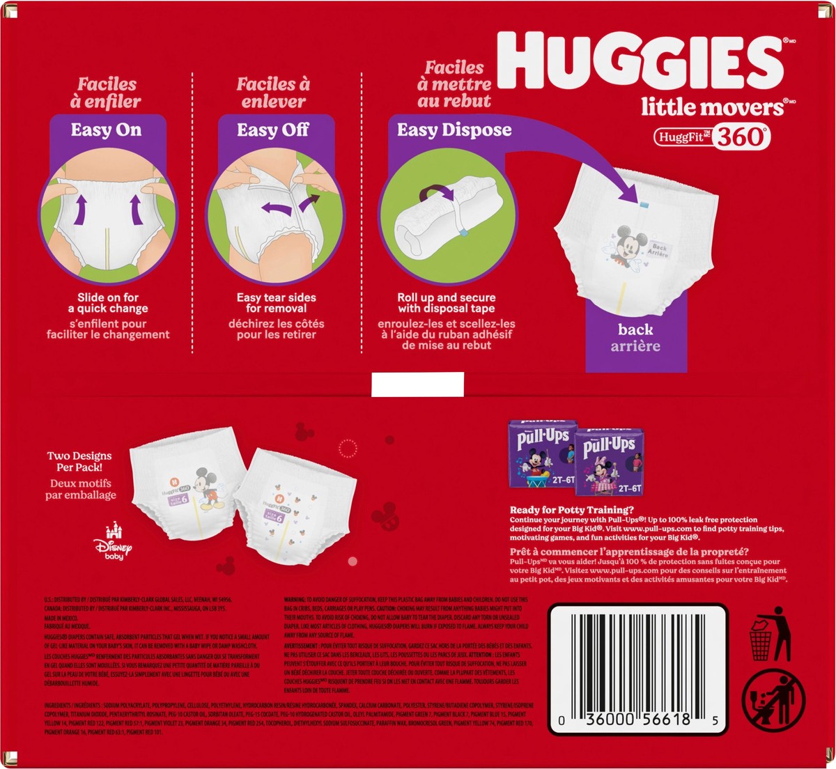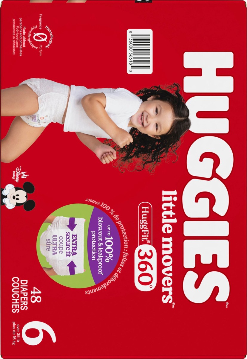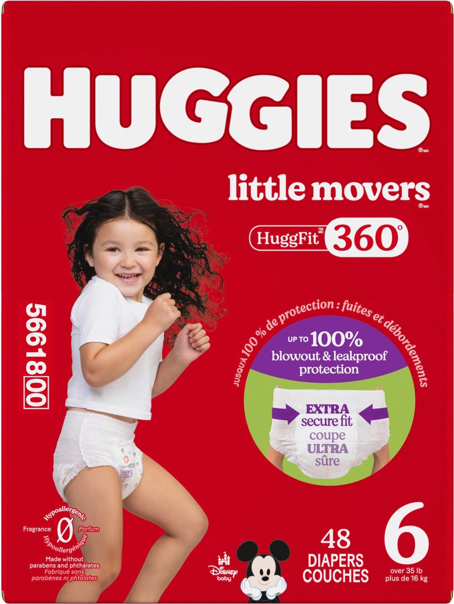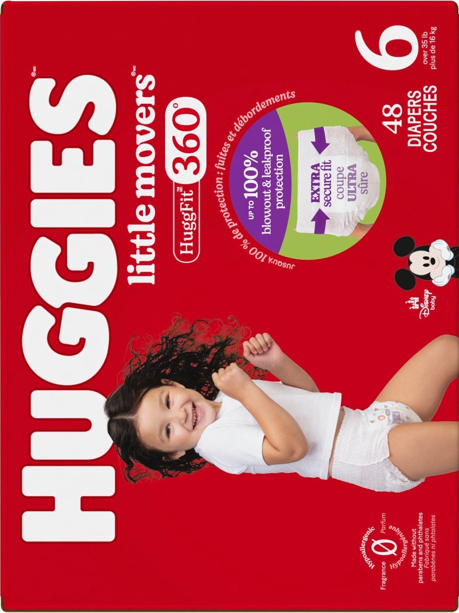 Huggies Little Movers HuggFit 360° Baby Diapers have 360° protection to help prevent leaks from any angle and an extra secure waistband designed to move with baby during play. HuggFit 360° slip-on dia…