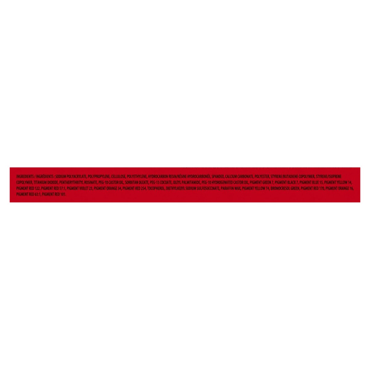 Sodium Polyacrylate, Polypropylene, Cellulose, Polyethylene, Hydrocarbon Resin/Résine Hydrocarbonée, Spandex, Calcium Carbonate, Polyester, Styrene/Butadiene Copolymer, Styrene/Isoprene Copolymer, Tit…