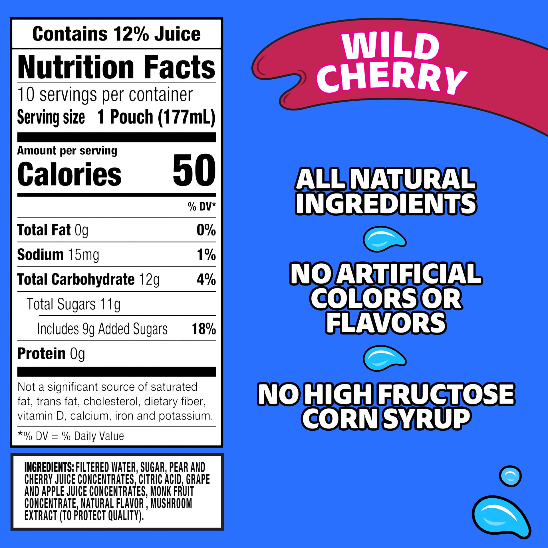 Filtered Water, Sugar, Pear and Cherry Juice Concentrates, Monk Fruit Concentrate, Citric Acid, Grape and Apple Juice Concentrates, Natural Flavor, Mushroom Extract (to Protect Quality).