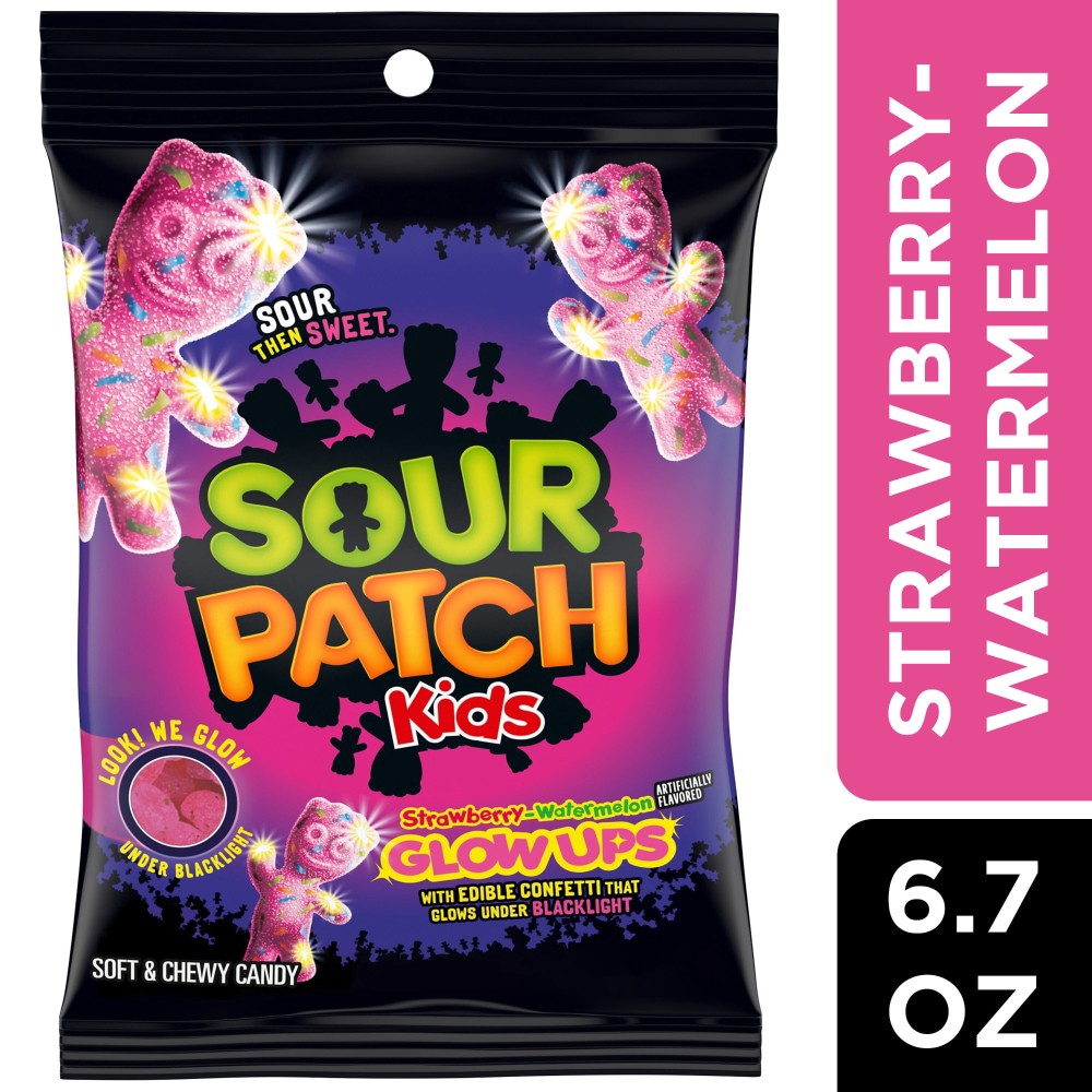 Shine a light on your next snacking session with SOUR PATCH KIDS Glow Ups Strawberry-Watermelon Soft & Chewy Candy. These sour gummies feature edible confetti that glows under blacklight and a SOUR TH…