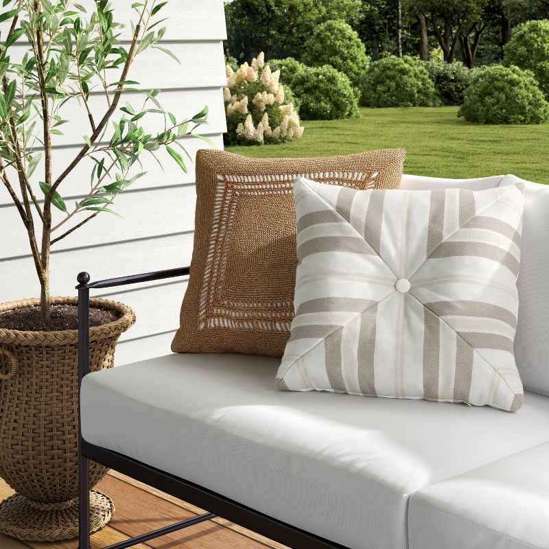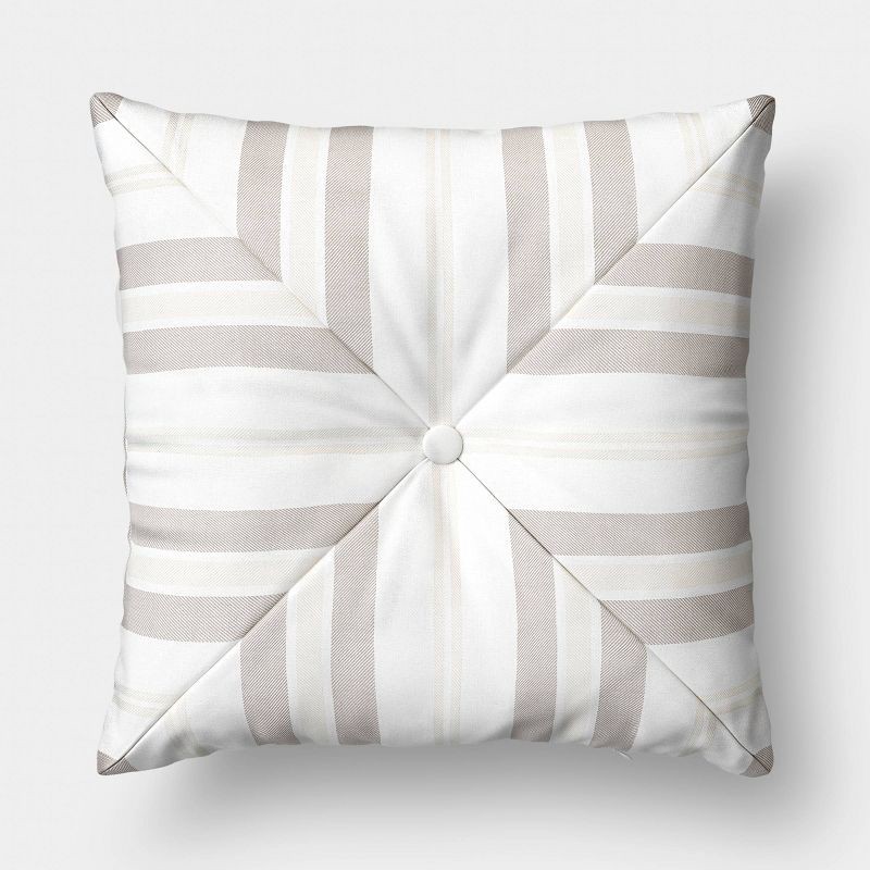Add a modern accent to your outdoor oasis with this Square Outdoor Throw Pillow from Threshold™ designed with Studio McGee. This 18-inch square features a geometric pattern accented with a button-tuft…