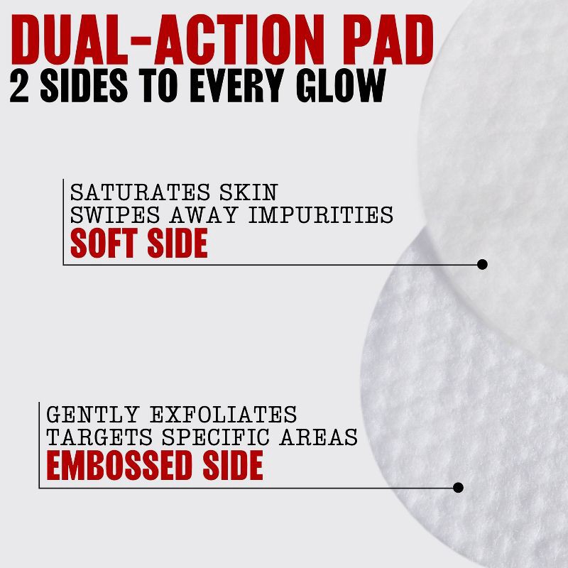 - DUAL ACTION PAD Dual sided pads featuring a smooth side, to swipe away impurities, and embossed side for a gentle exfoliation.