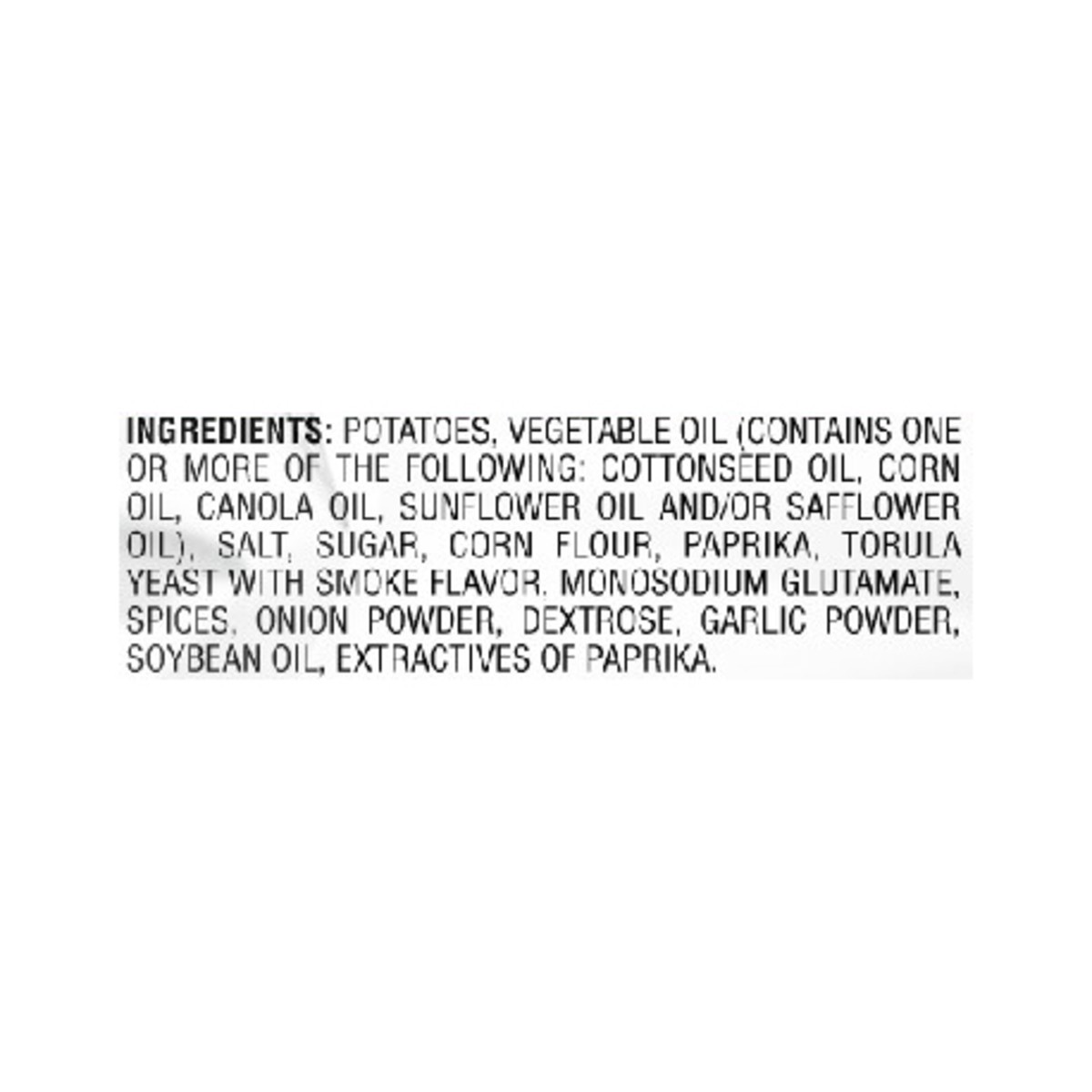 Potatoes, Vegetable Oil (Contains One or More of the Following: Cottonseed Oil, Corn Oil, Canola Oil, Sunflower Oil and/or Safflower Oil), Salt, Sugar, Corn Flour, Paprika, Torula Yeast with Smoke Fla…