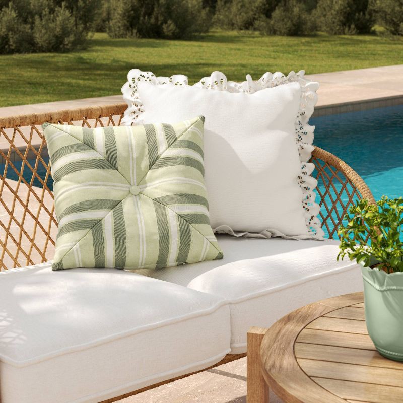 Add a modern accent to your outdoor oasis with this Square Outdoor Throw Pillow from Threshold™ designed with Studio McGee. This 18-inch square features a geometric pattern accented with a button-tuft…