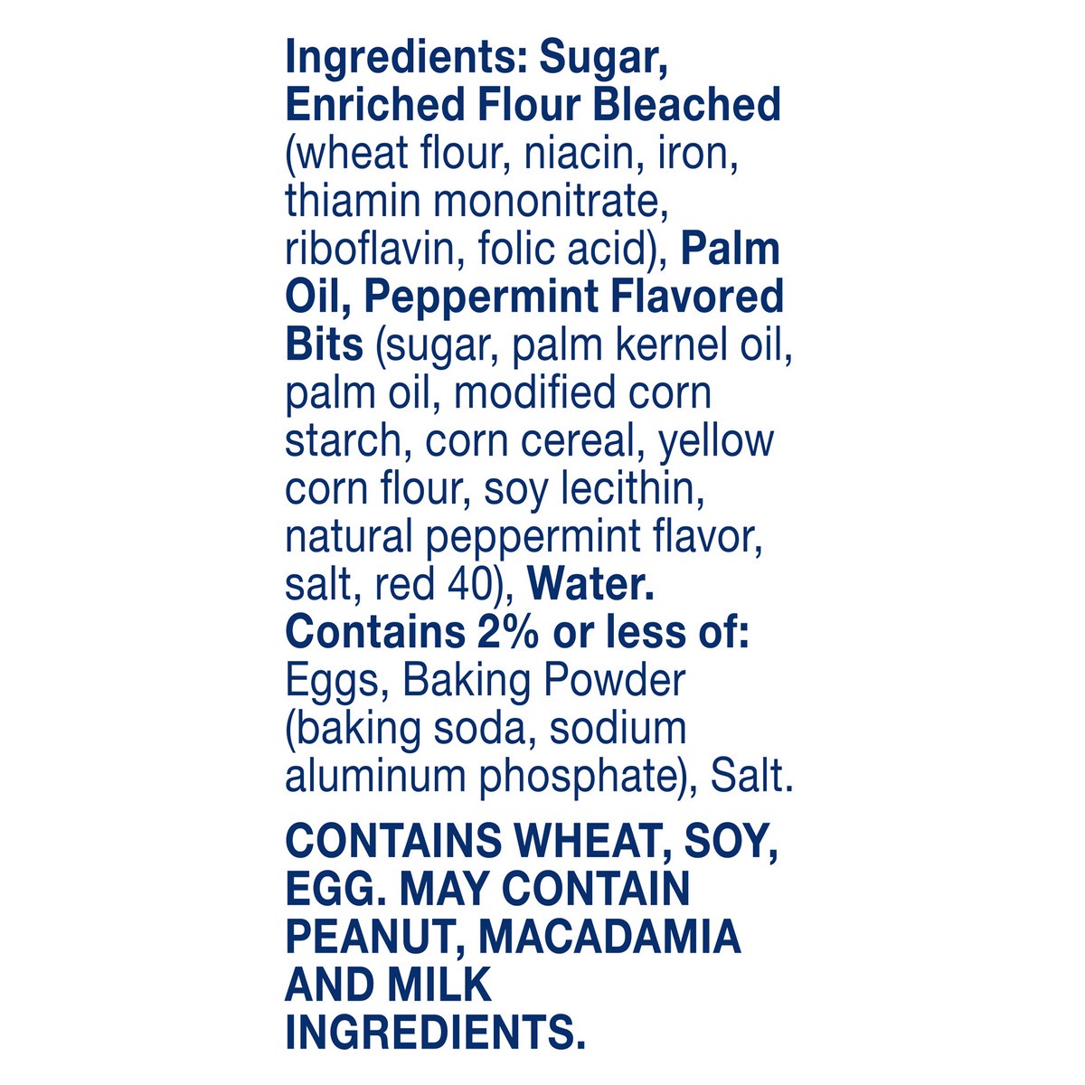 Sugar, Enriched Flour Bleached (Wheat Flour, Niacin, Iron, Thiamin Mononitrate, Riboflavin, Folic Acid, Palm Oil, Peppermint Flavored Bits (Sugar, Palm Kernel Ail, Palm Oil, Modified Corn Starch, Corn…