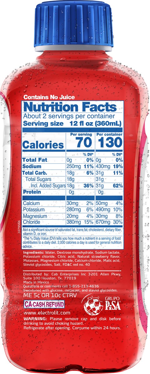 A strawberry-flavored electrolyte drink that helps with hydration It contains electrolytes like magnesium, calcium, potassium, and sodium, which can help your body rehydrate and recover