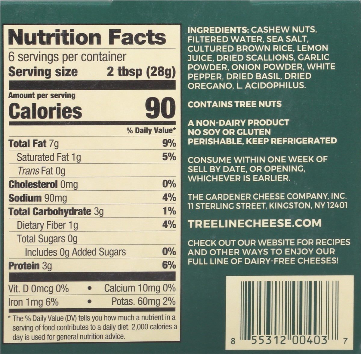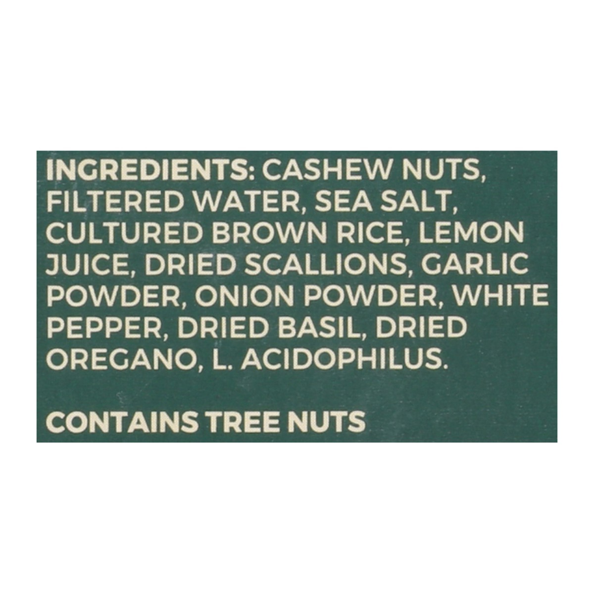 Cashews, Filtered Water, Sea Salt, Cultured Brown Rice, Lemon Juice, Scallions, Garlic, Onion, White Pepper, Basil, Oregano, Cultures.