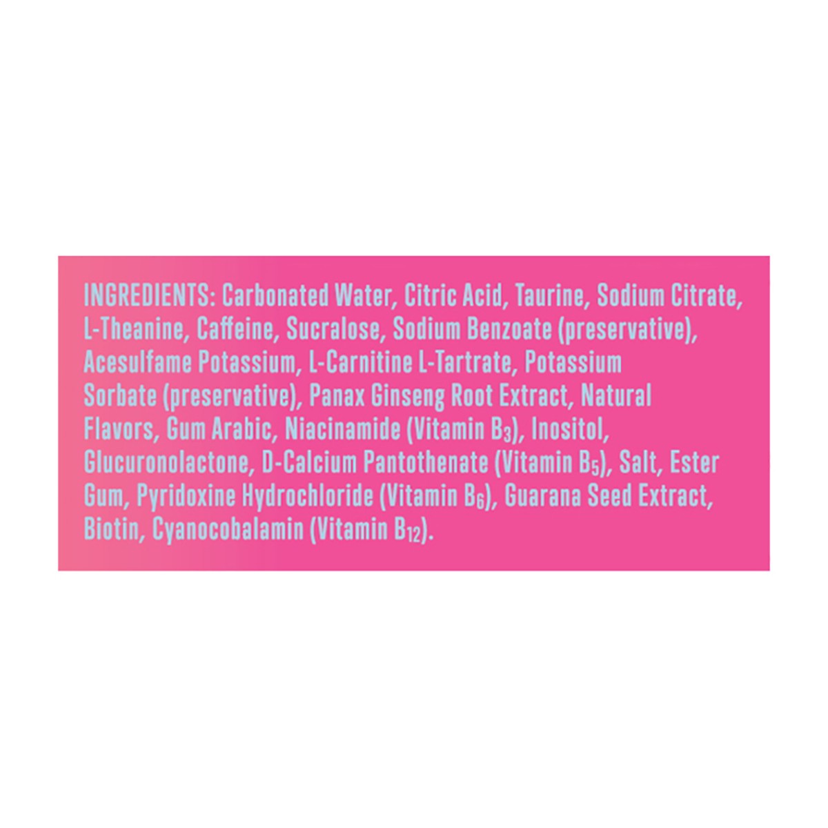 Carbonated Water\, Citric Acid\, Taurine\, Sodium Citrate\, L-Theanine\, Caffeine\, Sucralose\, Sodium Benzoate (Preservative)\, Acesulfame Potassium\, L-Carnitine L-Tartrate\, Potassium Sorbate (Pres…