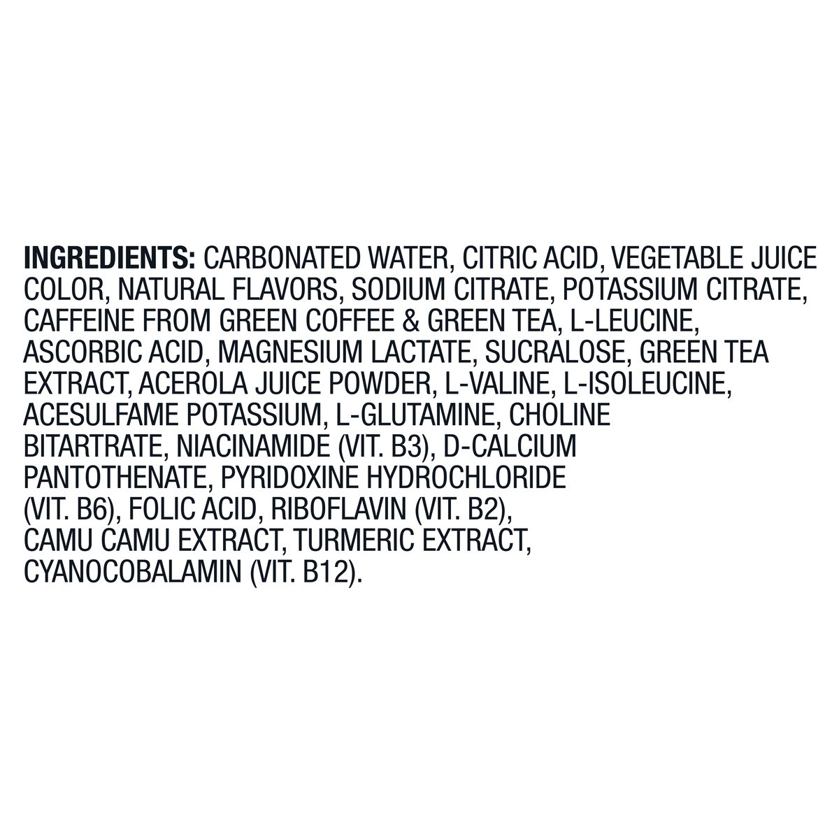Carbonated Water, Citric Acid, Vegetable Juice Color, Natural Flavors, Sodium Citrate, Potassium Citrate, Caffeine from Green Coffee & Green Tea, L-Leucine, Ascorbic Acid, Magnesium Lactate, Sucralose…