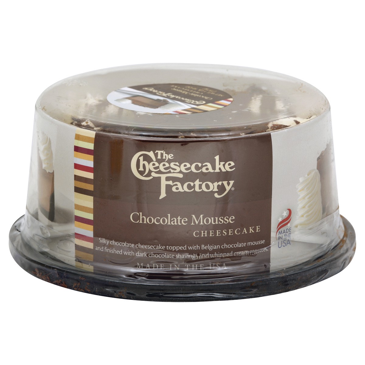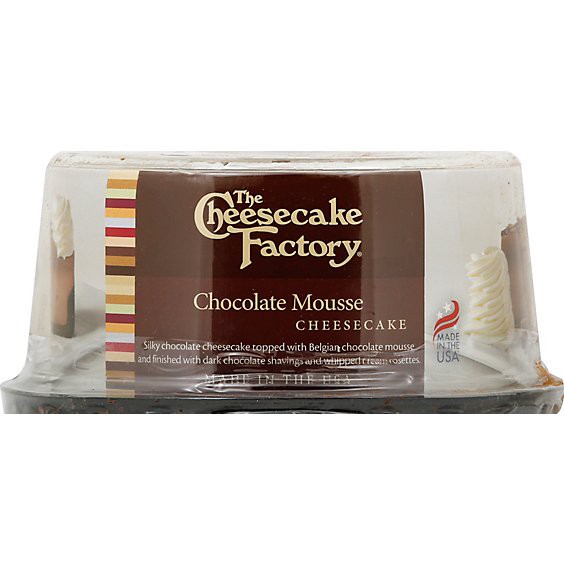 Silky chocolate cheesecake topped with Belgian chocolate mousse and finished with dark chocolate shavings and whipped cream rosettes. Made in the USA.