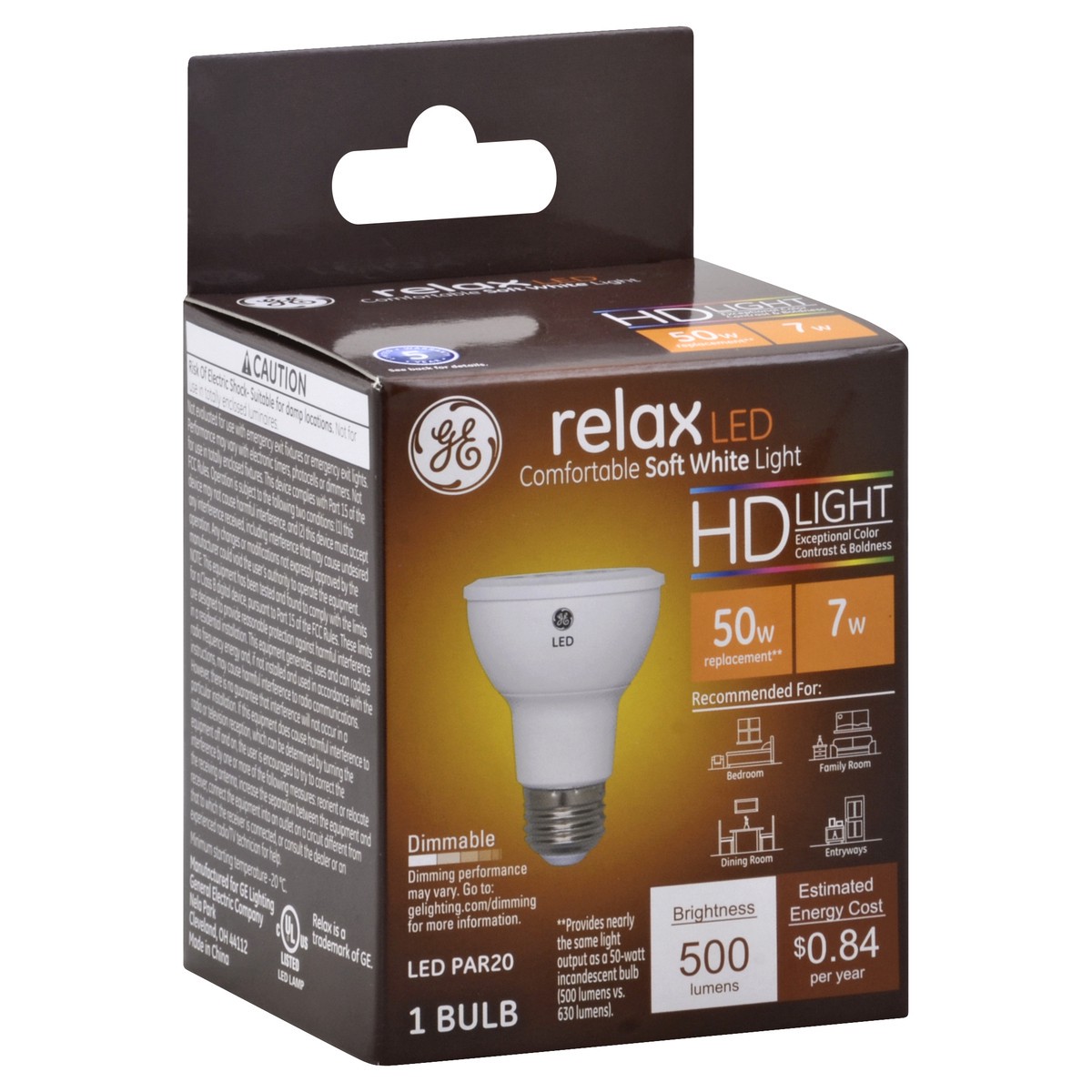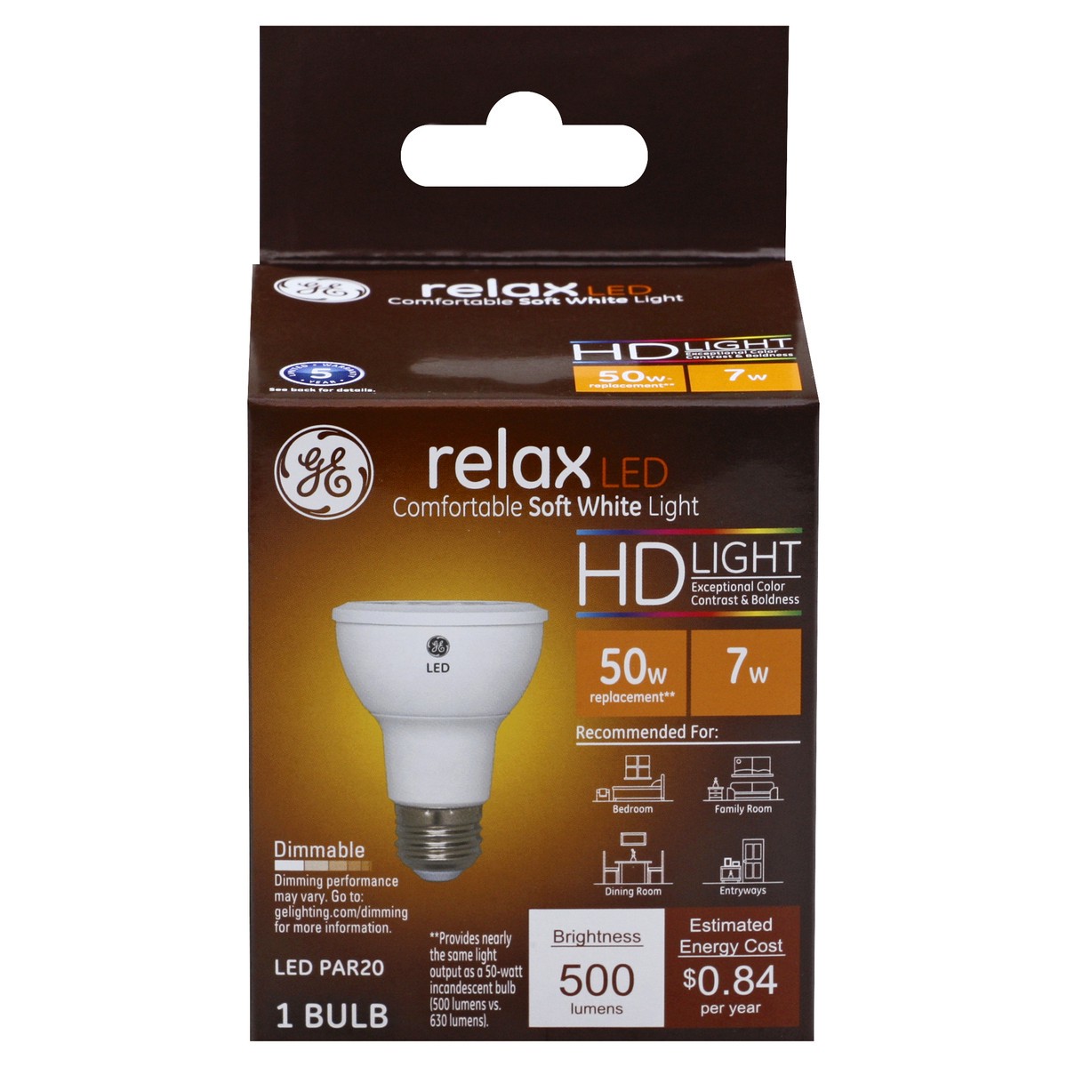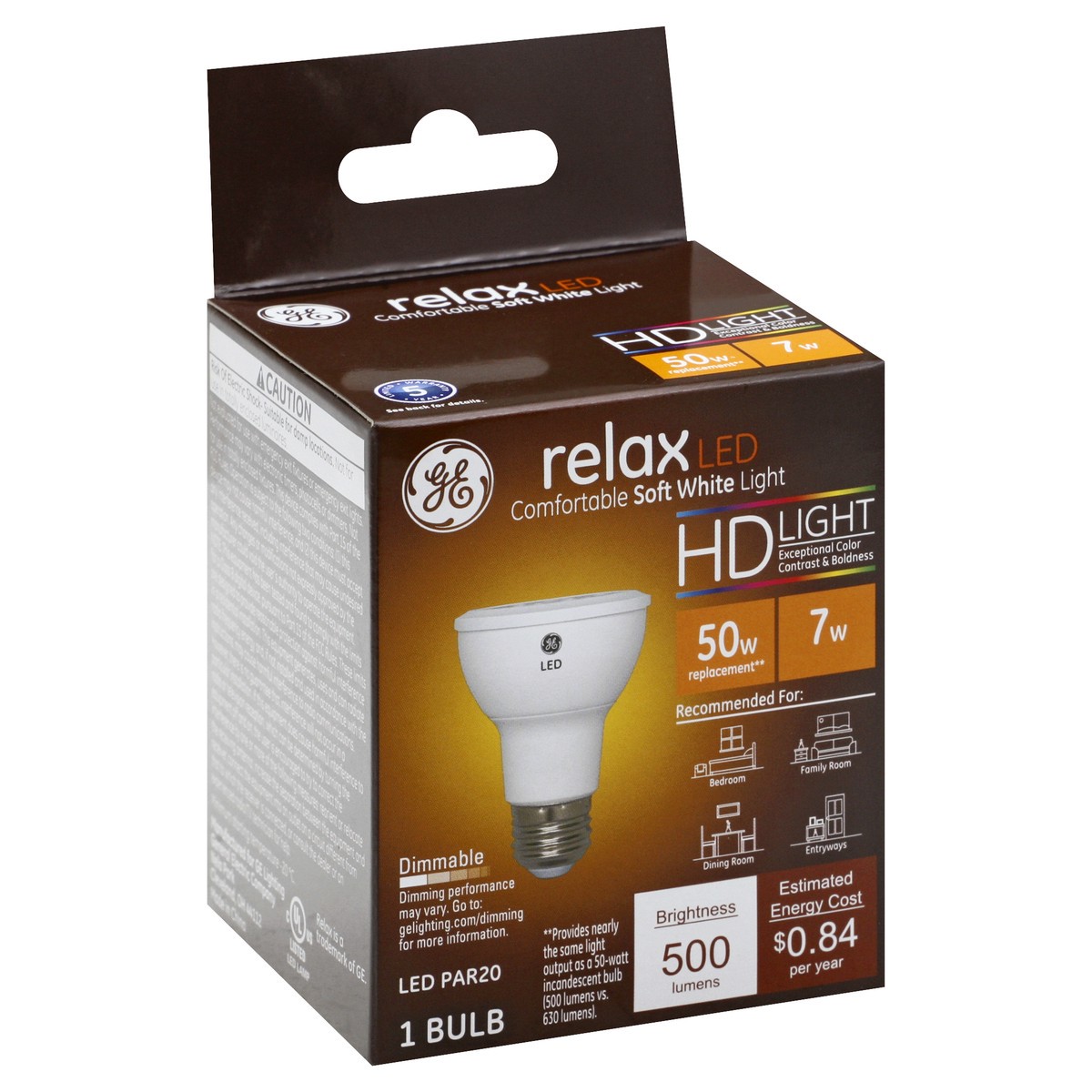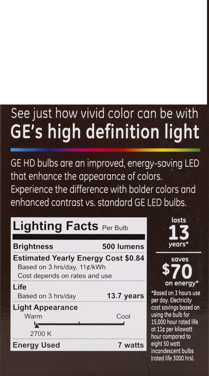 Brightness Quality: 500 Lumens. Energy Info: $0.84 based on 3 hrs/day, 11 cents/kWh. Cost depends on rates and use. 7 Watts. Package Info: 1 Bulb Info: LED Bulb Life: 13.7 Years based on 3 hrs/day. Bu…