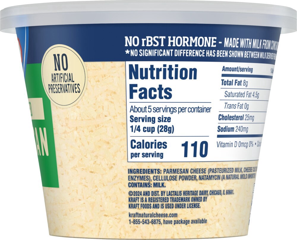 Parmesan Cheese (Pasteurized Milk, Cheese Culture, Salt, Enzymes), Cellulose Powder, Natamycin (a Natural Mold Inhibitor).