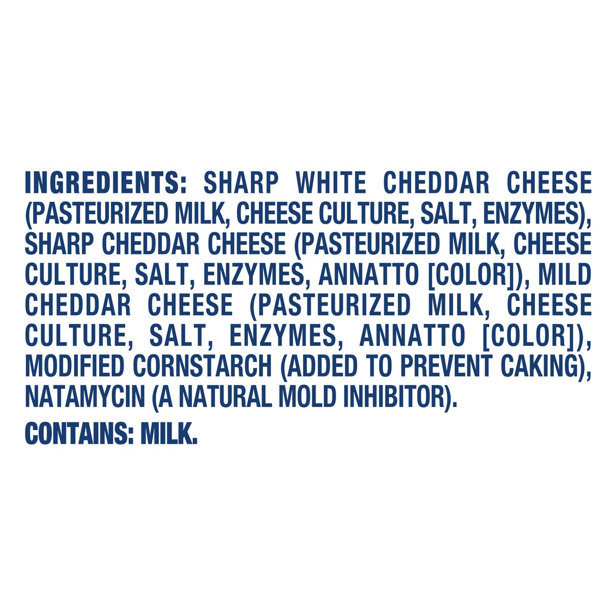 Sharp White Cheddar Cheese (Pasteurized Milk, Cheese Culture, Salt, Enzymes), Sharp Cheddar Cheese (Pasteurized Milk, Cheese Culture, Salt, Enzymes, Annatto [Color]), Mild Cheddar Cheese (Pasteurized …