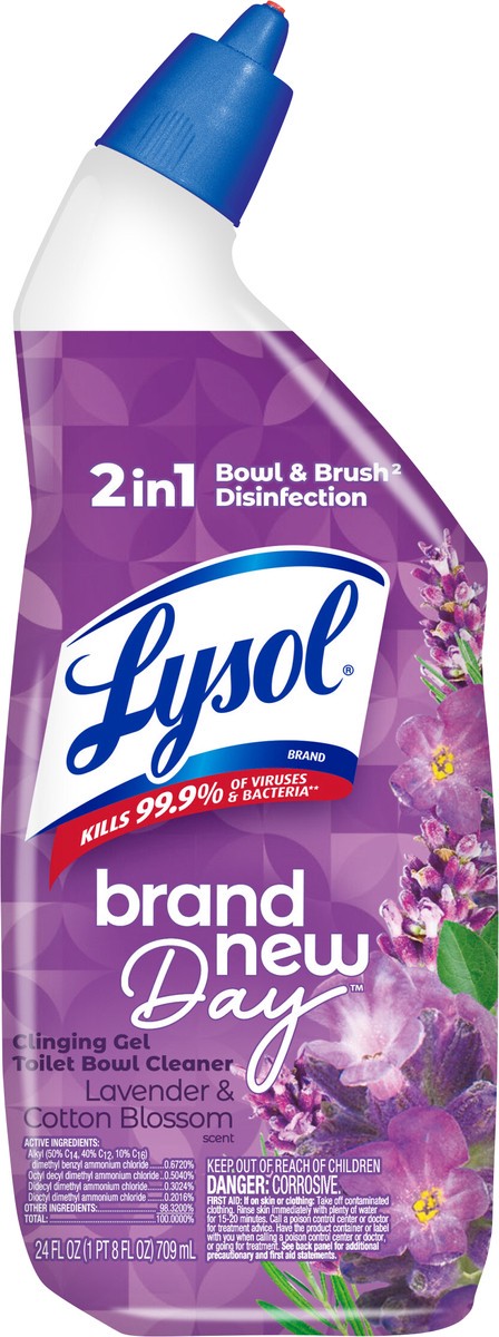Lysol Brand New Day™ Clinging Gel Toilet Bowl Cleaner cleans and disinfects toilets and leaves a refreshing Lavender & Cotton Blossom scent. The thick formula sticks to the bowl to power through stain…