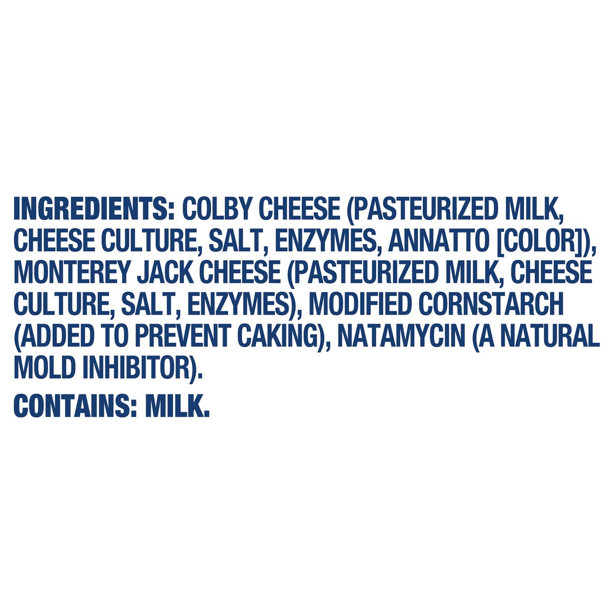 Colby Cheese (Pasteurized Milk, Cheese Culture, Salt, Enzymes, Annatto [Color]), Monterey Jack Cheese (Pasteurized Milk, Cheese Culture, Salt, Enzymes), Modified Cornstarch (Added to Prevent Caking), …