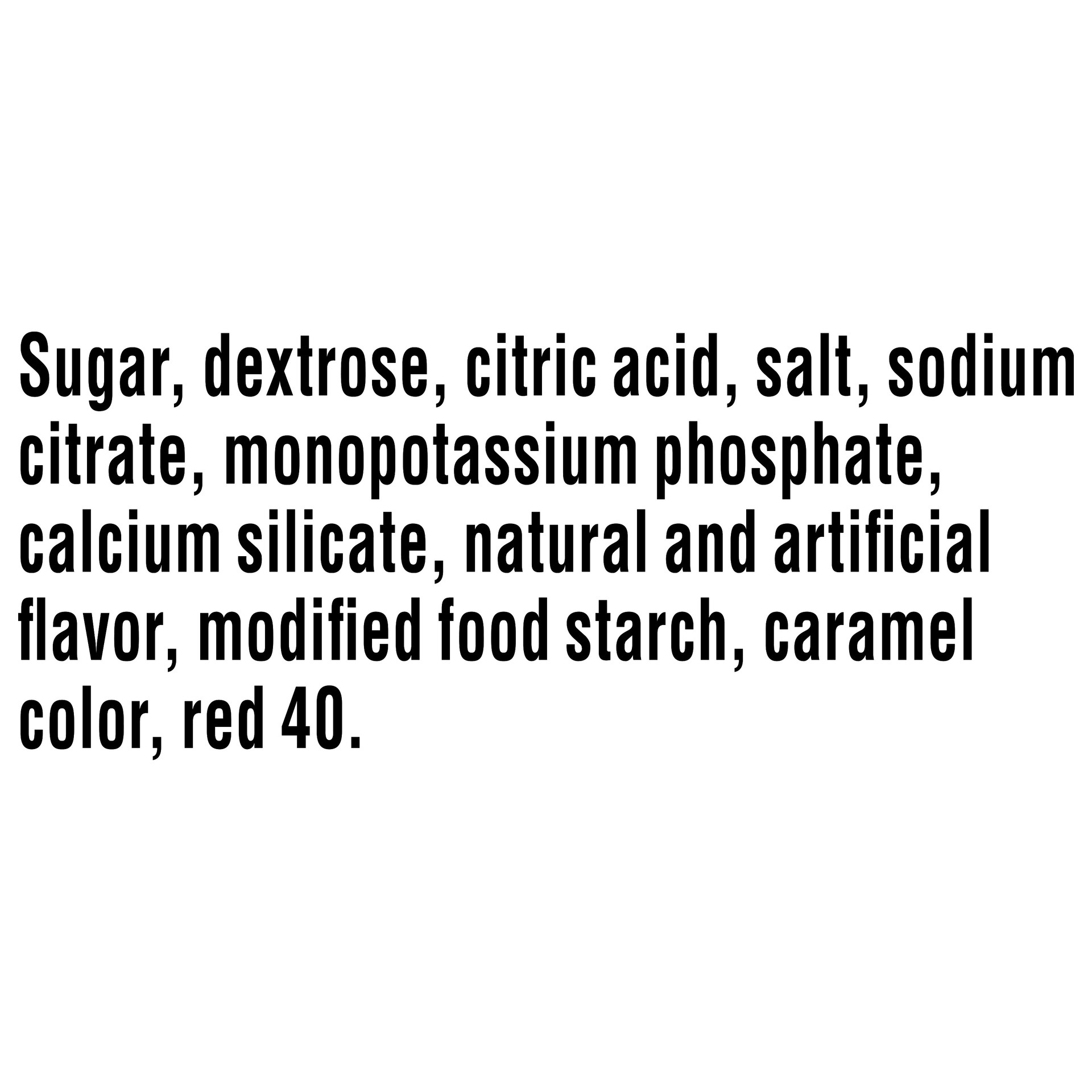 Sugar, Dextrose, Citric Acid, Salt, Sodium Citrate, Monopotassium Phosphate, Natural and Artificial Flavor, Calcium Silicate, Modified Food Starch, Red 40.