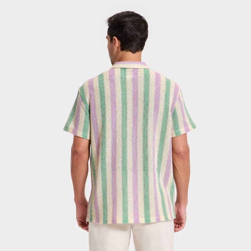Men's Short Sleeve Open Work Button-Down Camp Shirt - Goodfellow & Co™ - Green/Purple Striped S