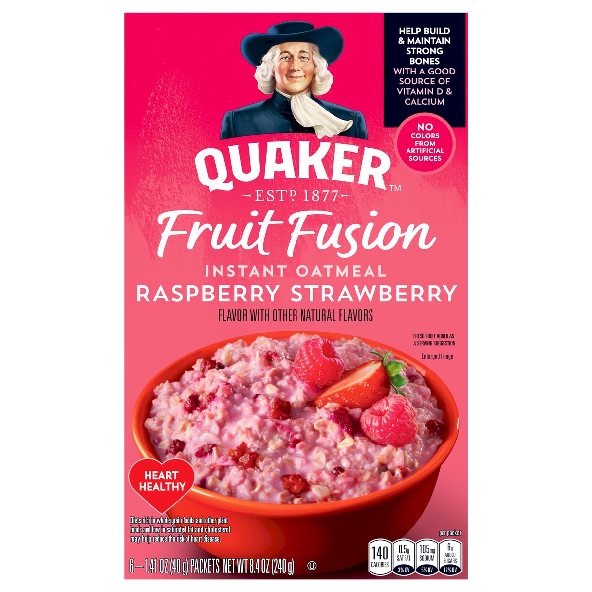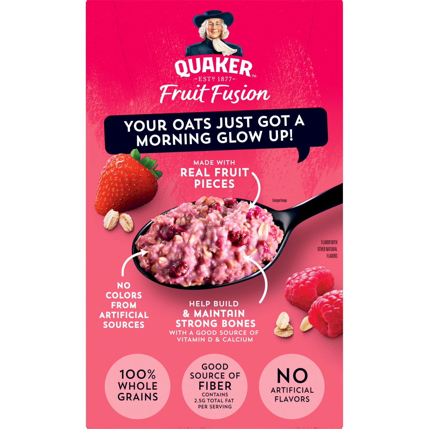 Whole Grain Oats, Sugar, Dried Raspberries, Dried Strawberries, Natural Flavor, Tricalcium Phosphate, Salt, Beet Juice Concentrate (Color), Iron, Vitamin D2 (Ergocalciferol).