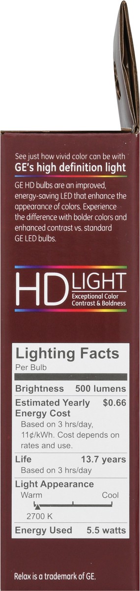 Brightness Quantity: 500 lumens. Energy Info: $0.66 based on 3 hrs/day, 11 cents/kWh. Cost depends on rates and use. 5.5 watts. Package Info: 1. Voltage: 120 volts. Bulb Info: Indoor. LED. Is Dimmable…