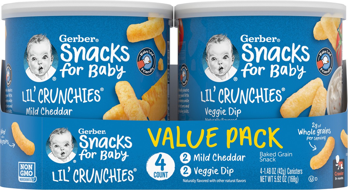 Gerber Lil' Crunchies Value Pack comes with 2 mild cheddar and 2 veggie dip. Gerber snacks are made with wholesome ingredients and strict quality standards just for babies. These stage 3 baby food sna…