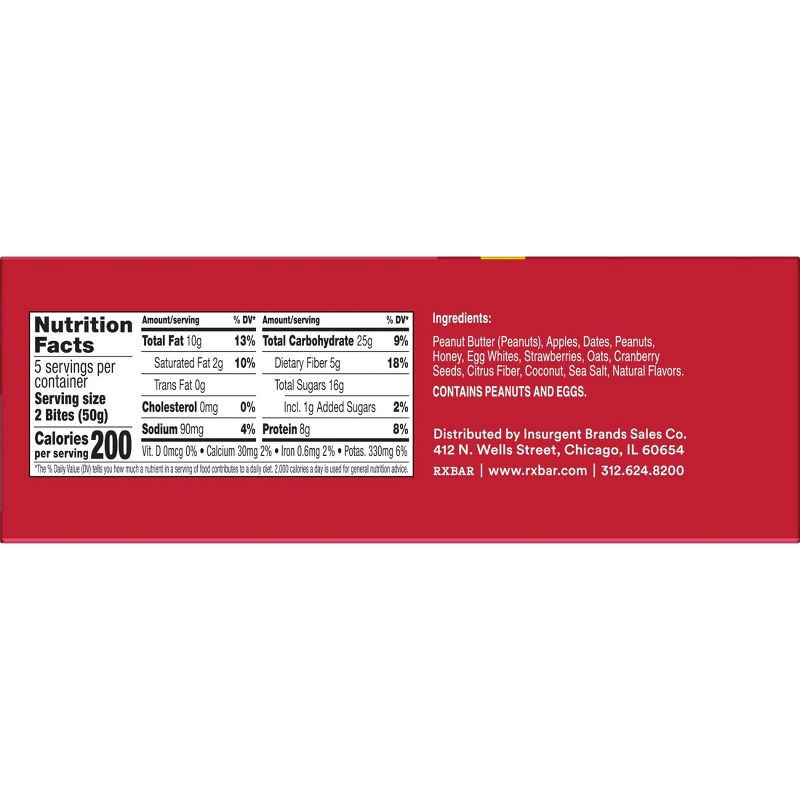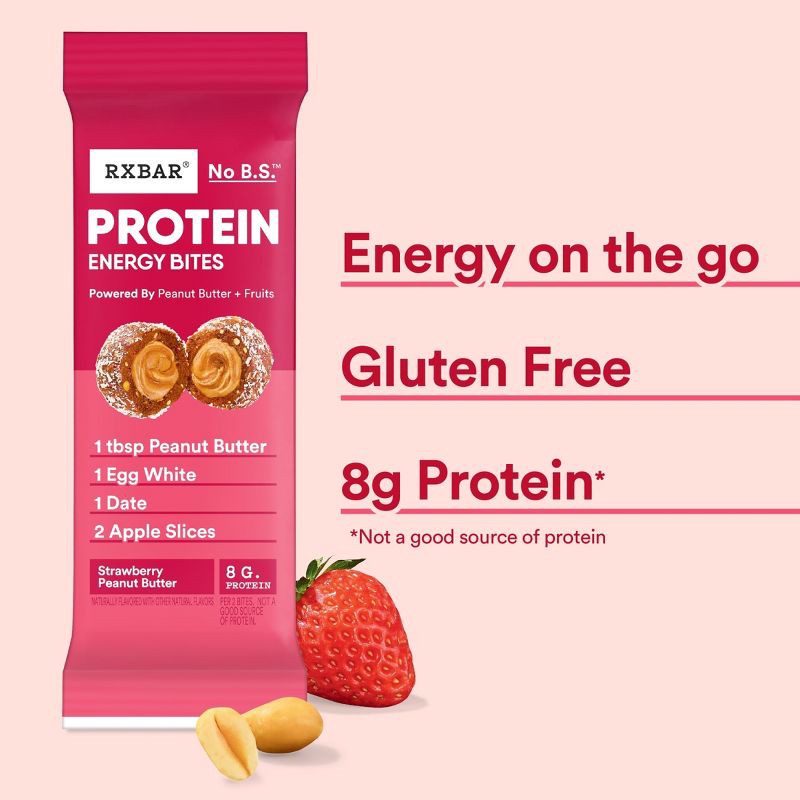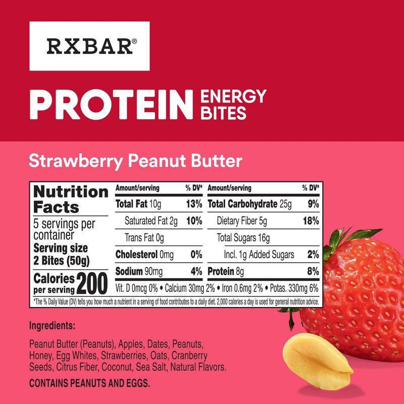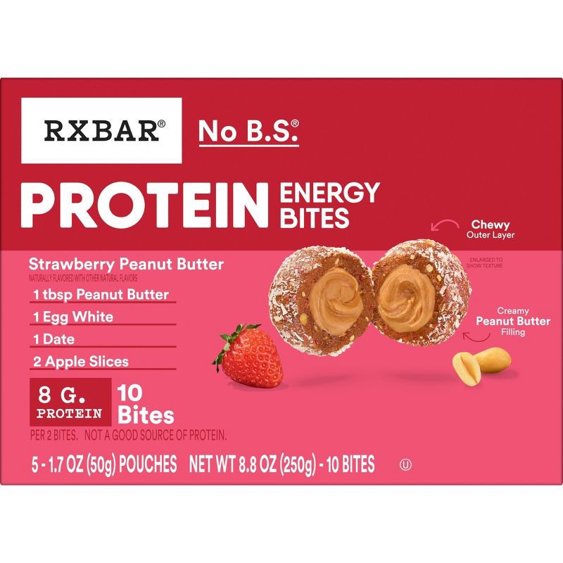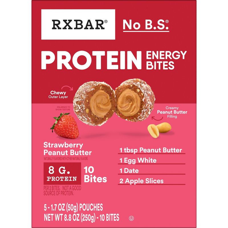 - Includes one 8.8oz box containing 5 pouches of RXBAR Protein Energy Bites Strawberry Peanut Butter; Two bites per pouch