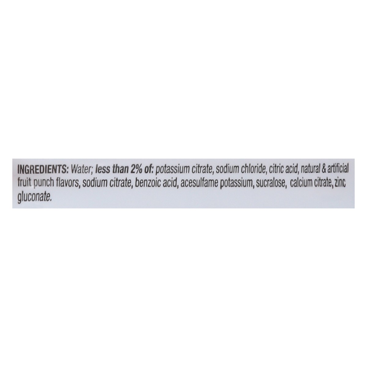 Water, Less than 2% of: Potassium Citrate, Sodium Chloride, Citric Acid, Natural & Artificial Fruit Punch Flavors, Sodium Citrate, Benzoic Acid, Acesulfame Potassium, Sucralose, Calcium Citrate, Zinc …