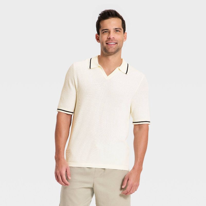 Men's Openwork Knit Johnny Collar Polo Sweater - Goodfellow & Co™ Cream S