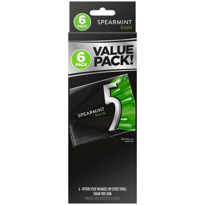 - Contains six (6) 15-stick packs of Sugar Free 5 Gum Spearmint Rain Sugar Free Chewing Gum