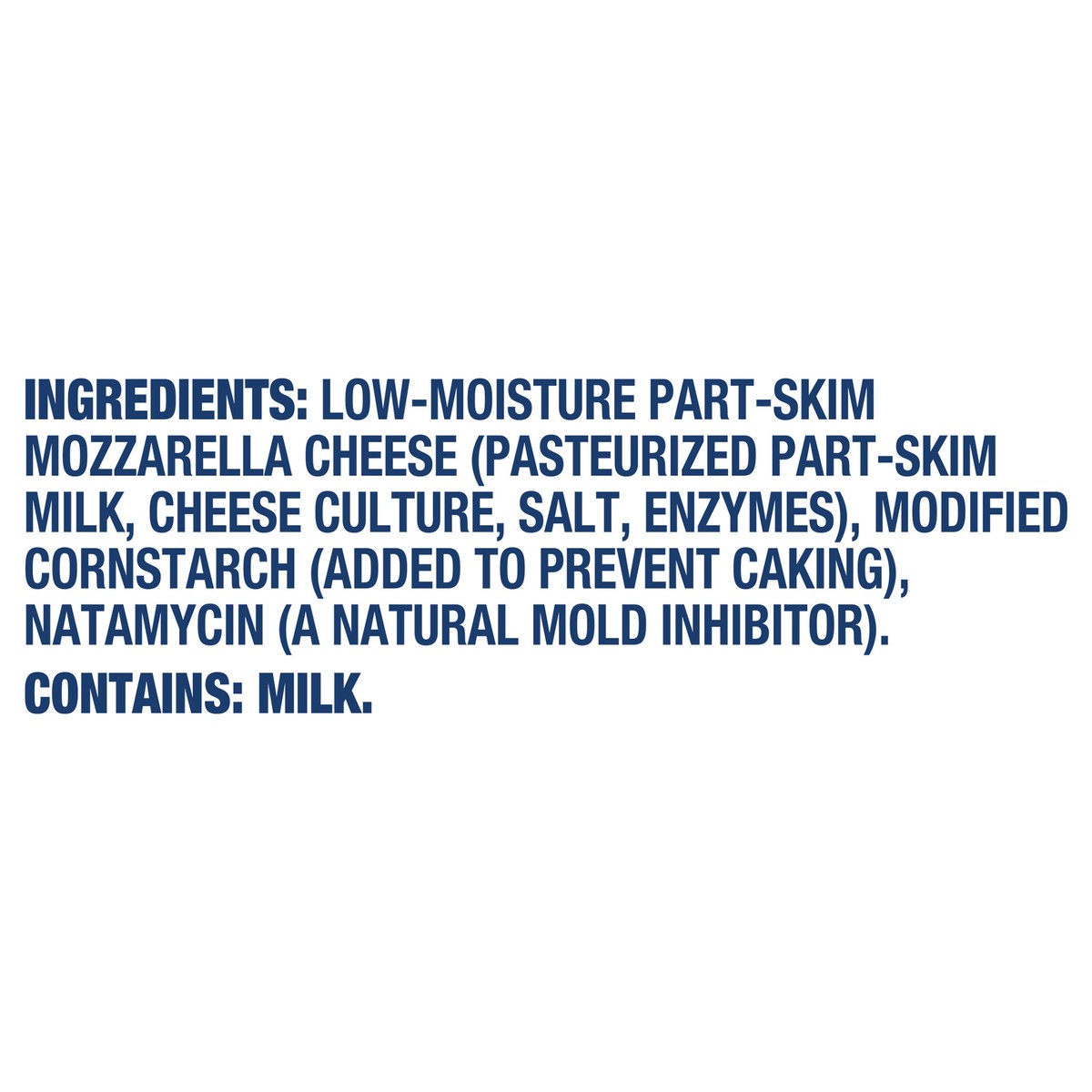 Low-Moisture Part-Skim Mozzarella Cheese (Pasteurized Part-Skim Milk, Cheese Culture, Salt, Enzymes), Modified Cornstarch (Added to Prevent Caking), Natamycin (a Natural Mold Inhibitor).