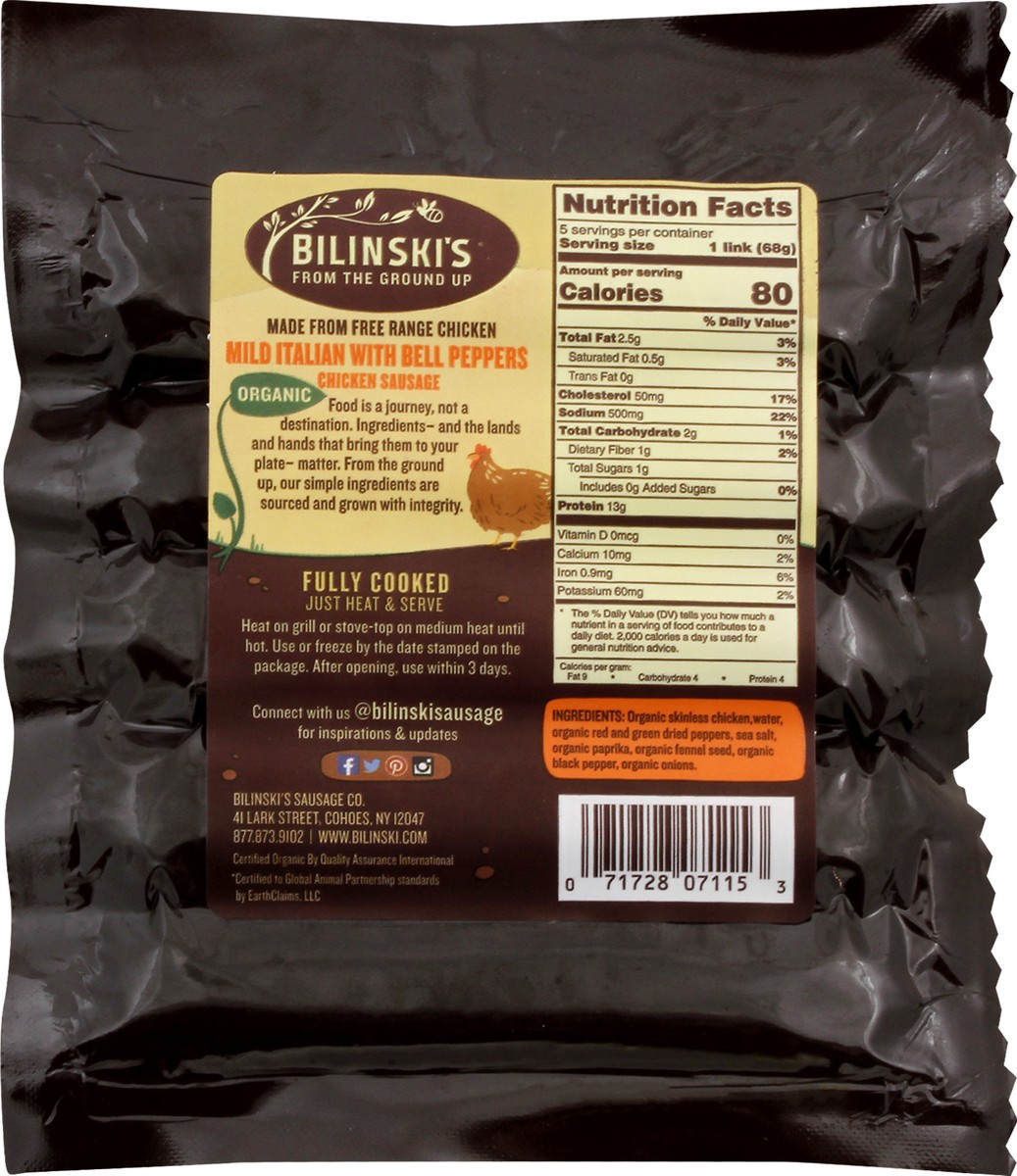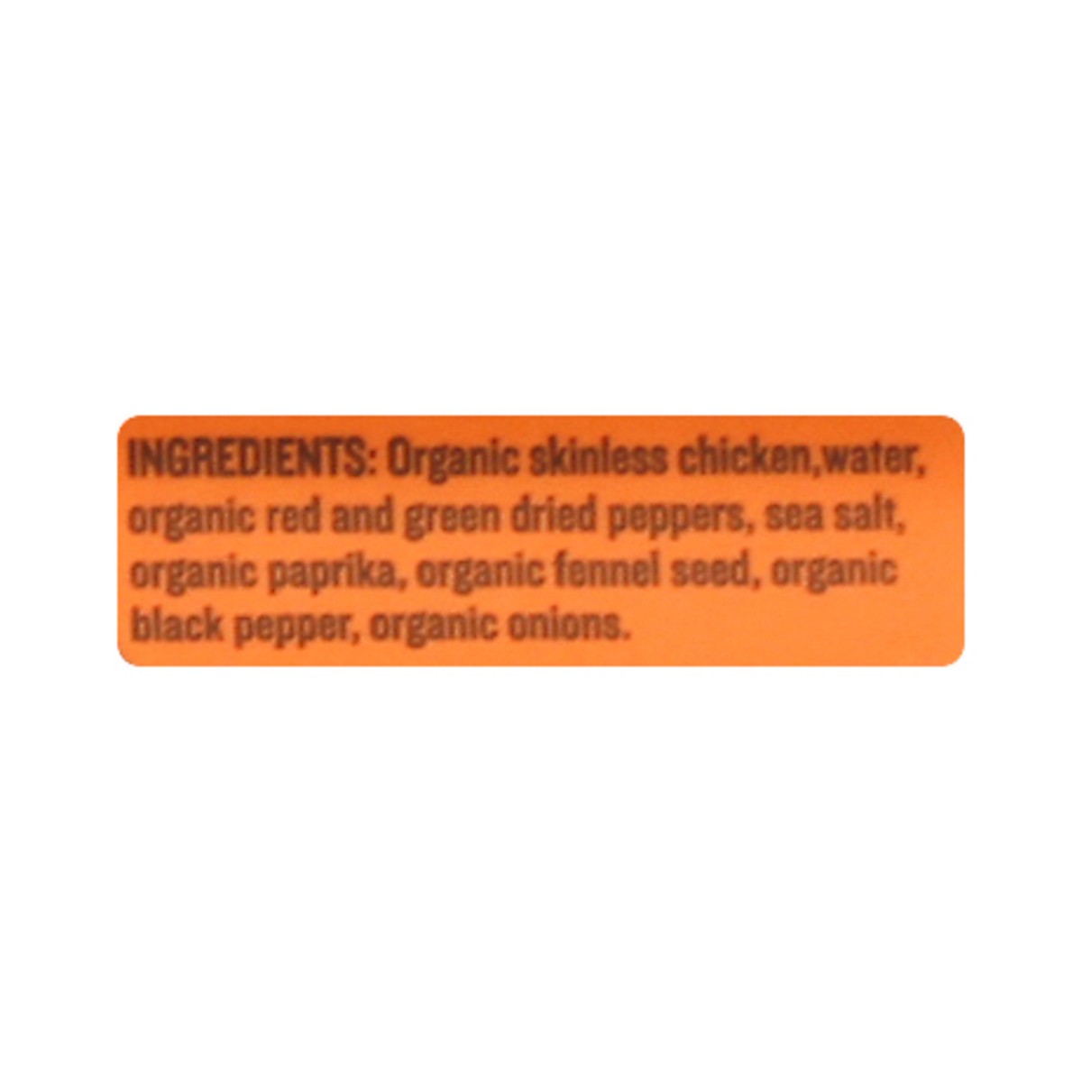 Organic Skinless Chicken, Water, Organic Red and Green Dried Peppers, Sea Salt, Organic Paprika, Organic Fennel Seed, Organic Black Pepper, Organic Onions.