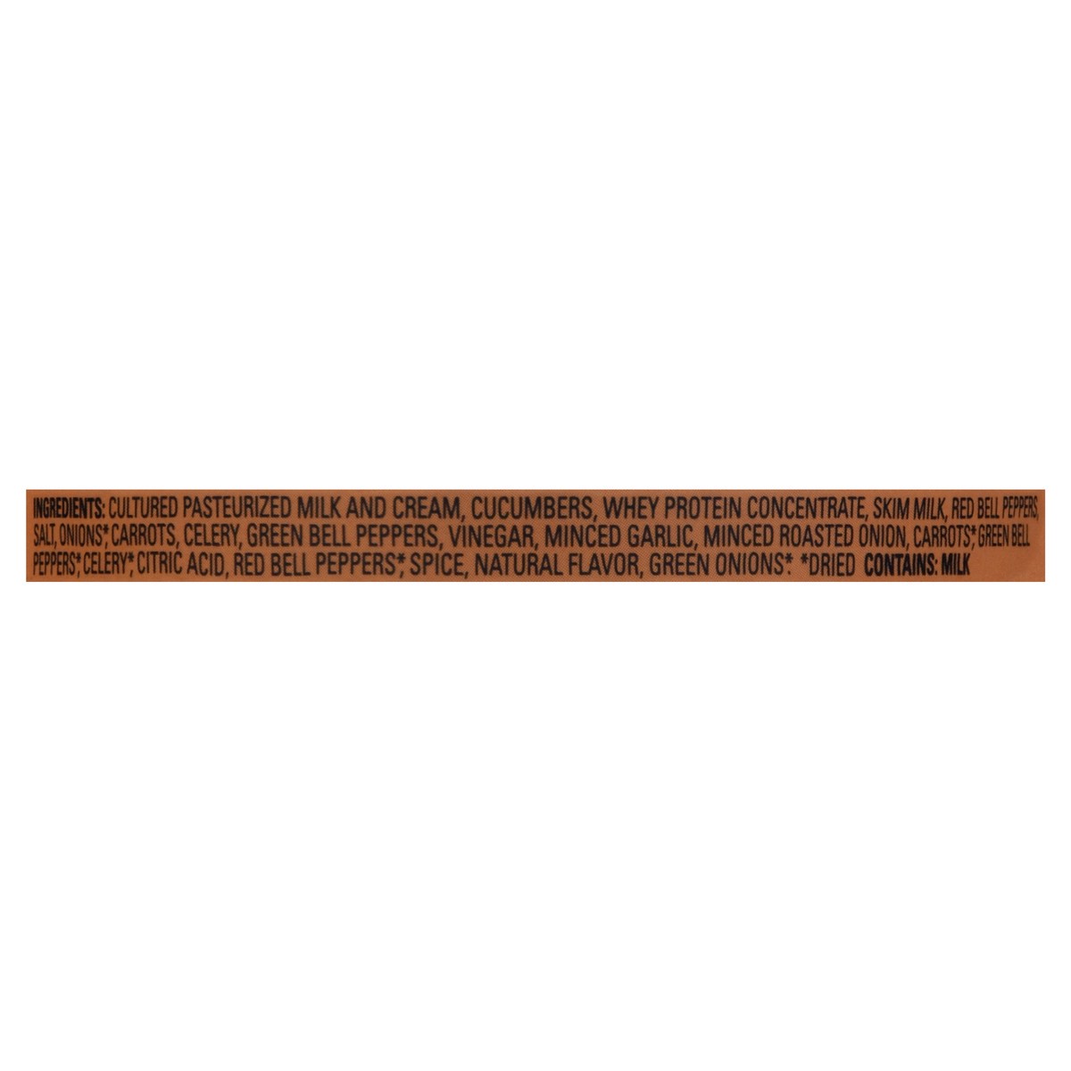 Cultured Pasteurized Milk and Cream, Cucumbers, Whey Protein Concentrate, Skim Milk, Red Bell Peppers, Salt, Onions (Dried), Carrots, Celery, Green Bell Peppers, Vinegar, Minced Garlic, Minced Roasted…