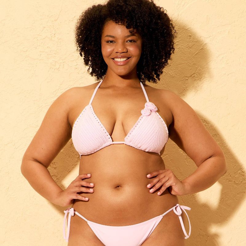 Feel fantastic by the shore wearing this Crochet Rosette Triangle Bikini Top from Shade & Shore™. This triangle swim top showcases a light pink crochet pattern with 3D rose-front detailing and feature…