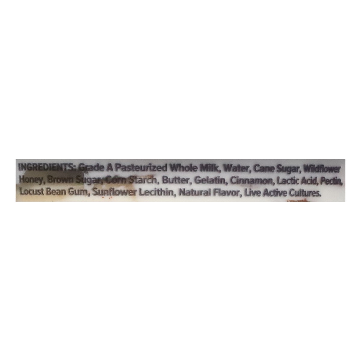 Grade A Pasteurized Whole Milk, Water, Cane Sugar, Wildflower Honey, Brown Sugar, Corn Starch, Butter, Gelatin, Cinnamon, Lactic Acid, Pectin, Locust Bean Gum, Sunflower Lecithin, Natural Flavor, Live…