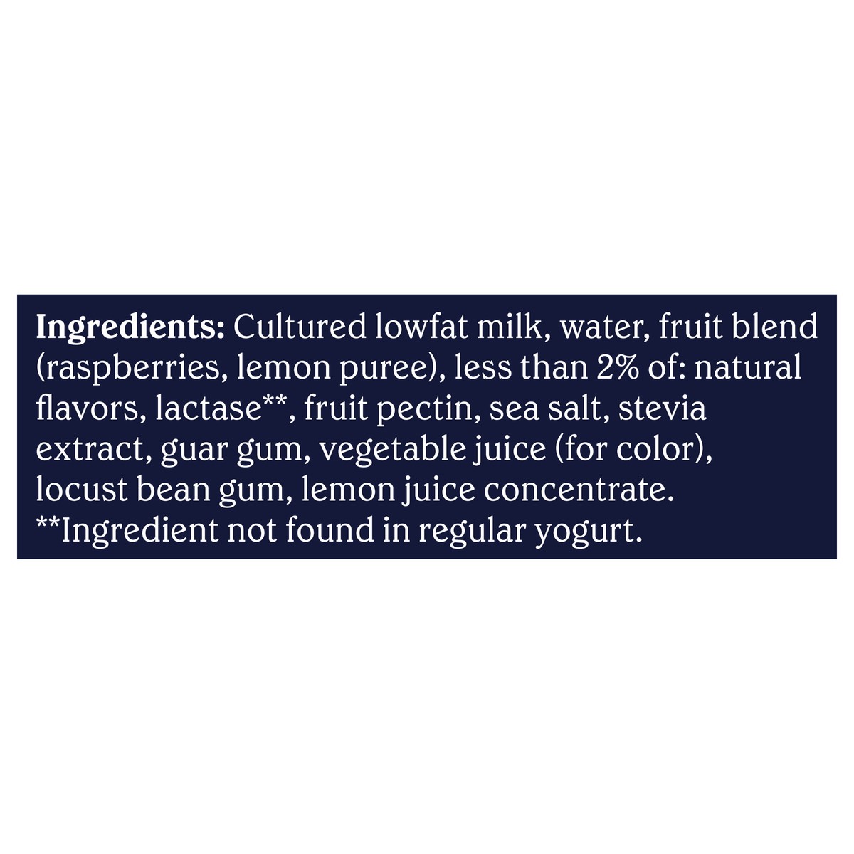 Cultured Lowfat Milk, Water, Fruit Blend (Raspberries, Lemon Puree), Less than 2% of: Natural Flavors, Lactase**, Fruit Pectin, Sea Salt, Stevia Extract, Guar Gum, Vegetable Juice (for Color), Locust …