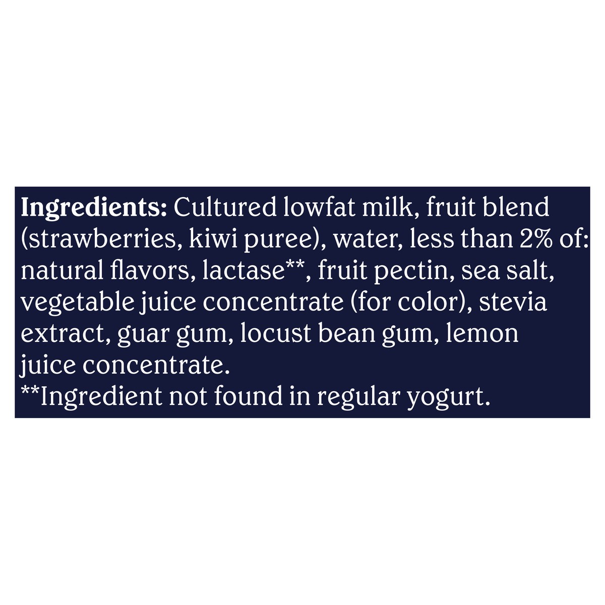 Cultured Lowfat Milk, Fruit Blend (Strawberries, Kiwi Puree), Water, Less than 2% of: Natural Flavors, Lactase**, Fruit Pectin, Sea Salt, Vegetable Juice Concentrate (for Color), Stevia Extract, Guar …