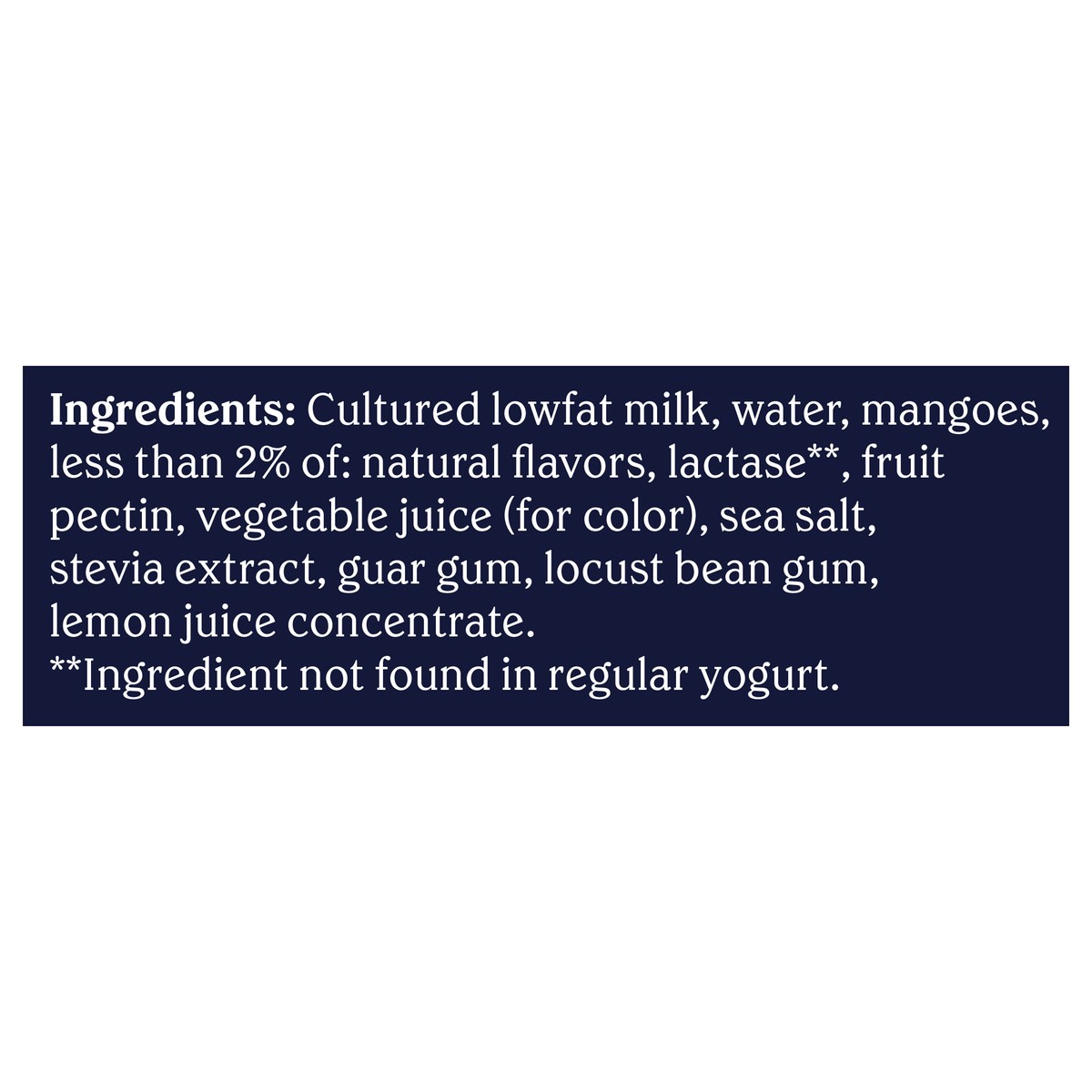 Cultured Lowfat Milk, Water, Mangoes, Less than 2% of: Natural Flavors, Lactase**, Fruit Pectin, Vegetable Juice (for Color), Sea Salt, Stevia Extract, Guar Gum, Locust Bean Gum, Lemon Juice Concentra…