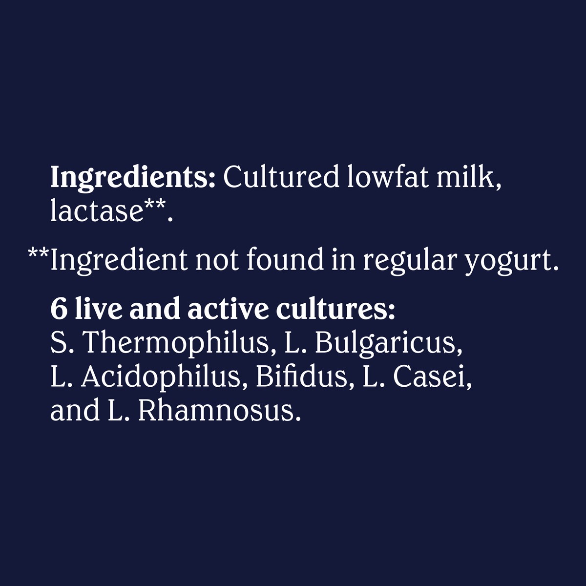 Cultured Lowfat milk, lactase. Ingredients not found in regular yogurt.6 live and active cultures"S. Thermophilus, L. Bulgaricus, L. Acidophilus, Bifidus, L. Casei, and L. Rhamnosus