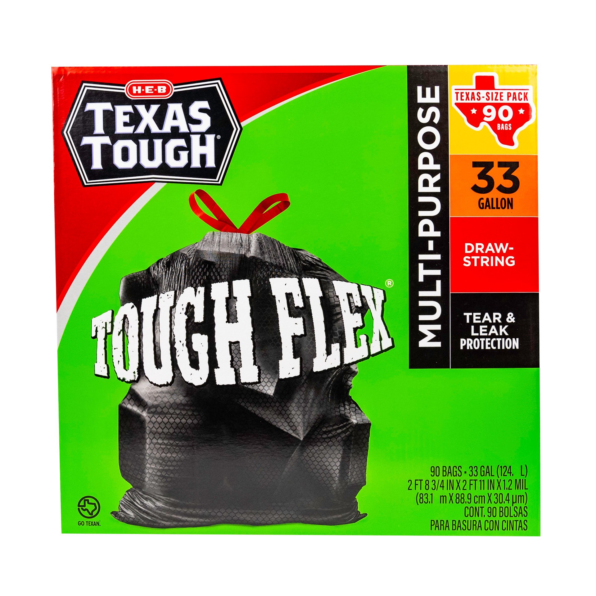 Made to flex and fit bulky, odd-shaped items, these large H-E-B Texas Tough multi-purpose trash bags have a roomy 33-gallon capacity. Handy for gathering up stuff around the house or tossing away wast…