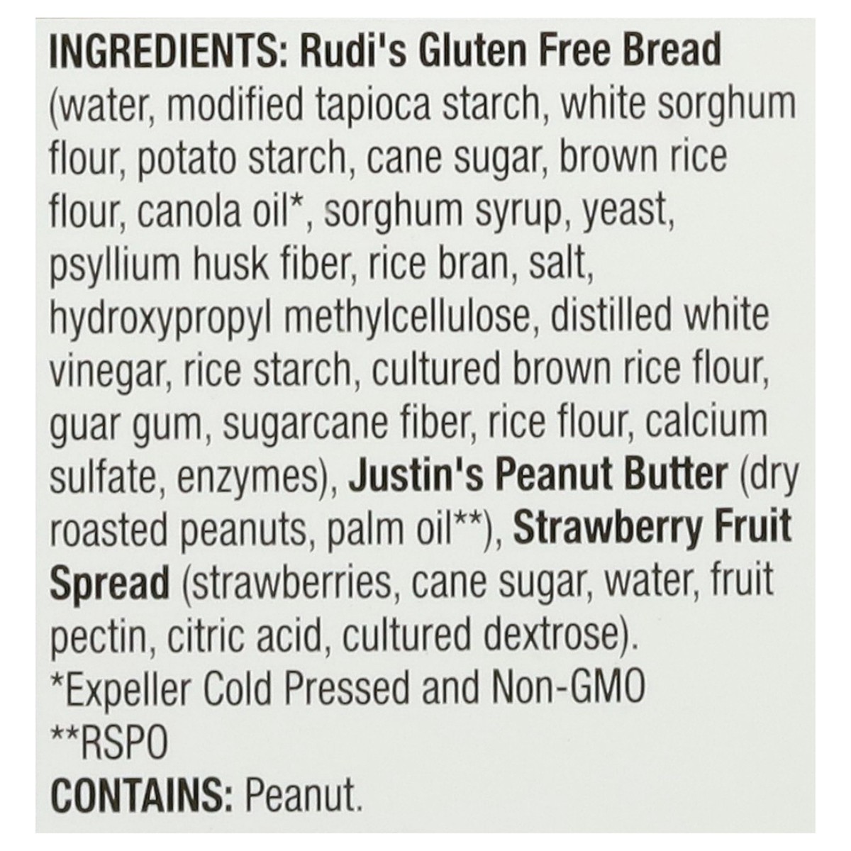 Rudi's Gluten Free Bread (Water, Modified Tapioca Starch, White Sorghum Flour, Potato Starch, Cane Sugar, Brown Rice Flour, Canola Oil*, Sorghum Syrup, Yeast, Psyllium Husk Fiber, Rice Bran, Salt, Hyd…