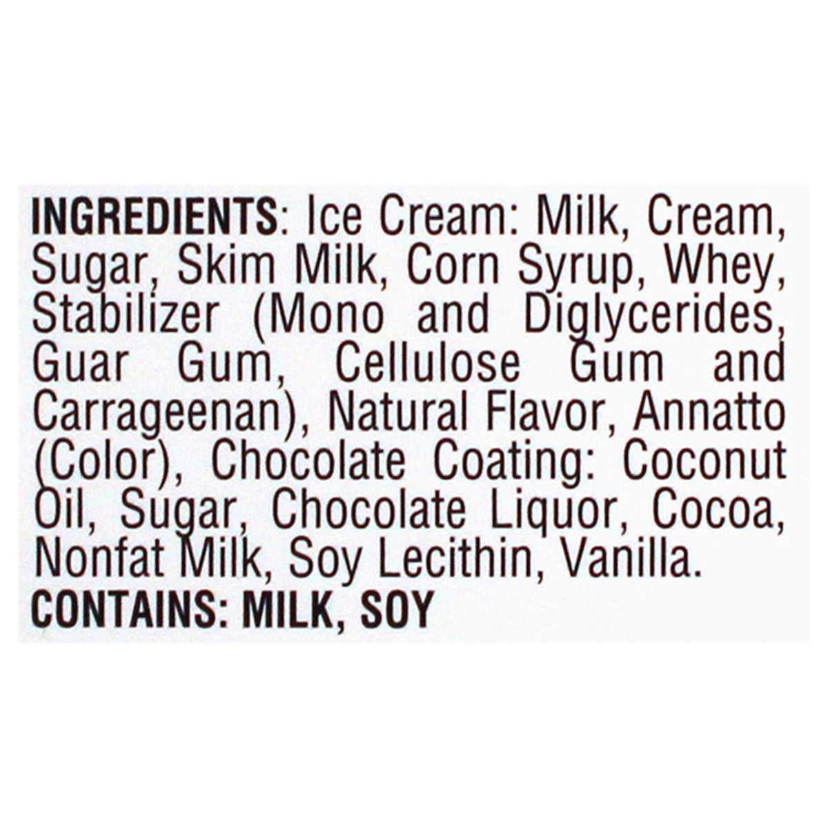 Ice Cream: Milk, Cream, Sugar, Skim Milk, Corn Syrup, Whey, Stabilizer (Mono and Diglycerides, Guar Gum, Cellulose Gum and Carrageenan), Natural Flavor, Annatto (Color), Chocolate Coating: Coconut Oil…