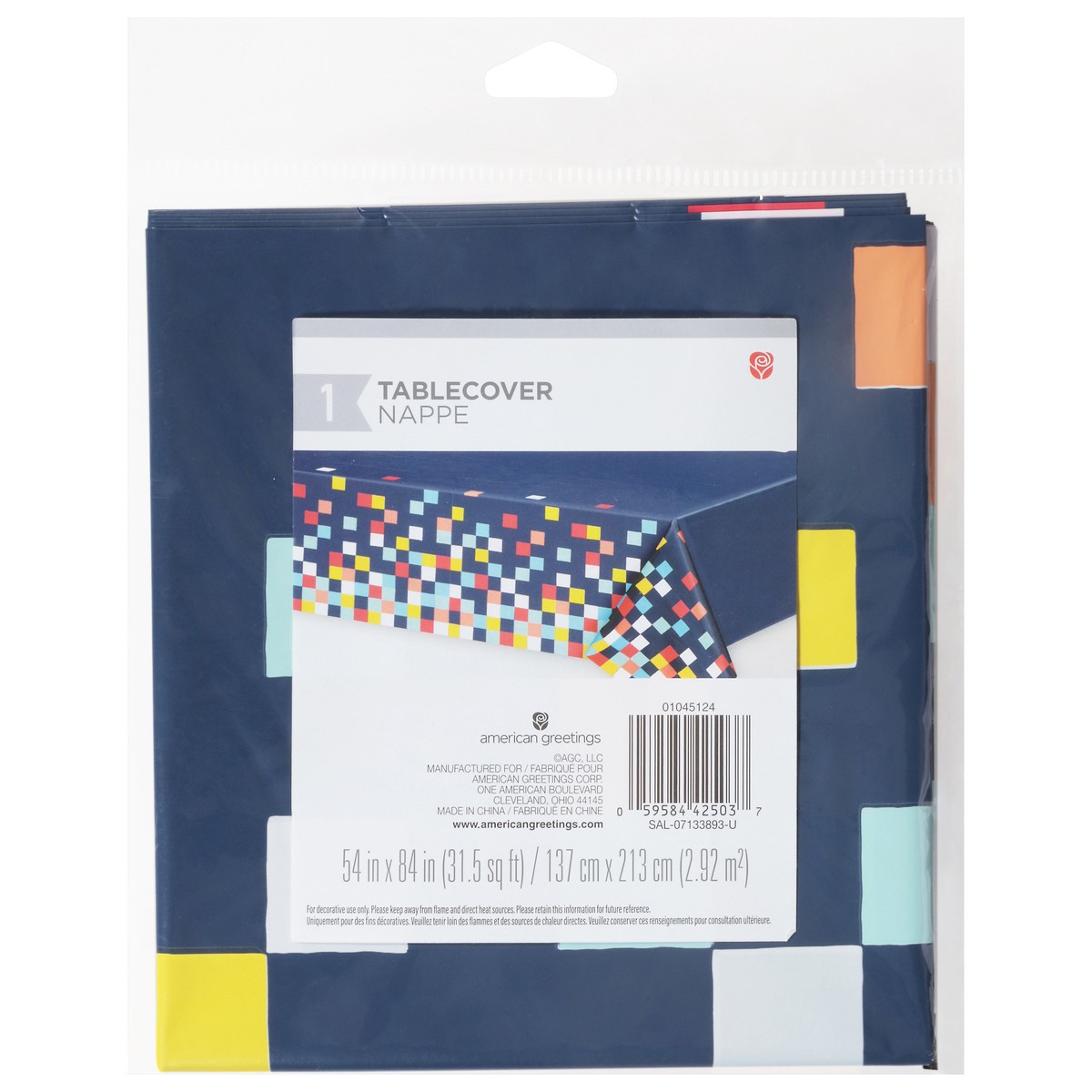 Set the table for any special party or picnic with this 54-inch-by-84-inch rectangular cover. The plastic navy blue cover features multi-colored mini squares on the edges. Can be used both indoors and…
